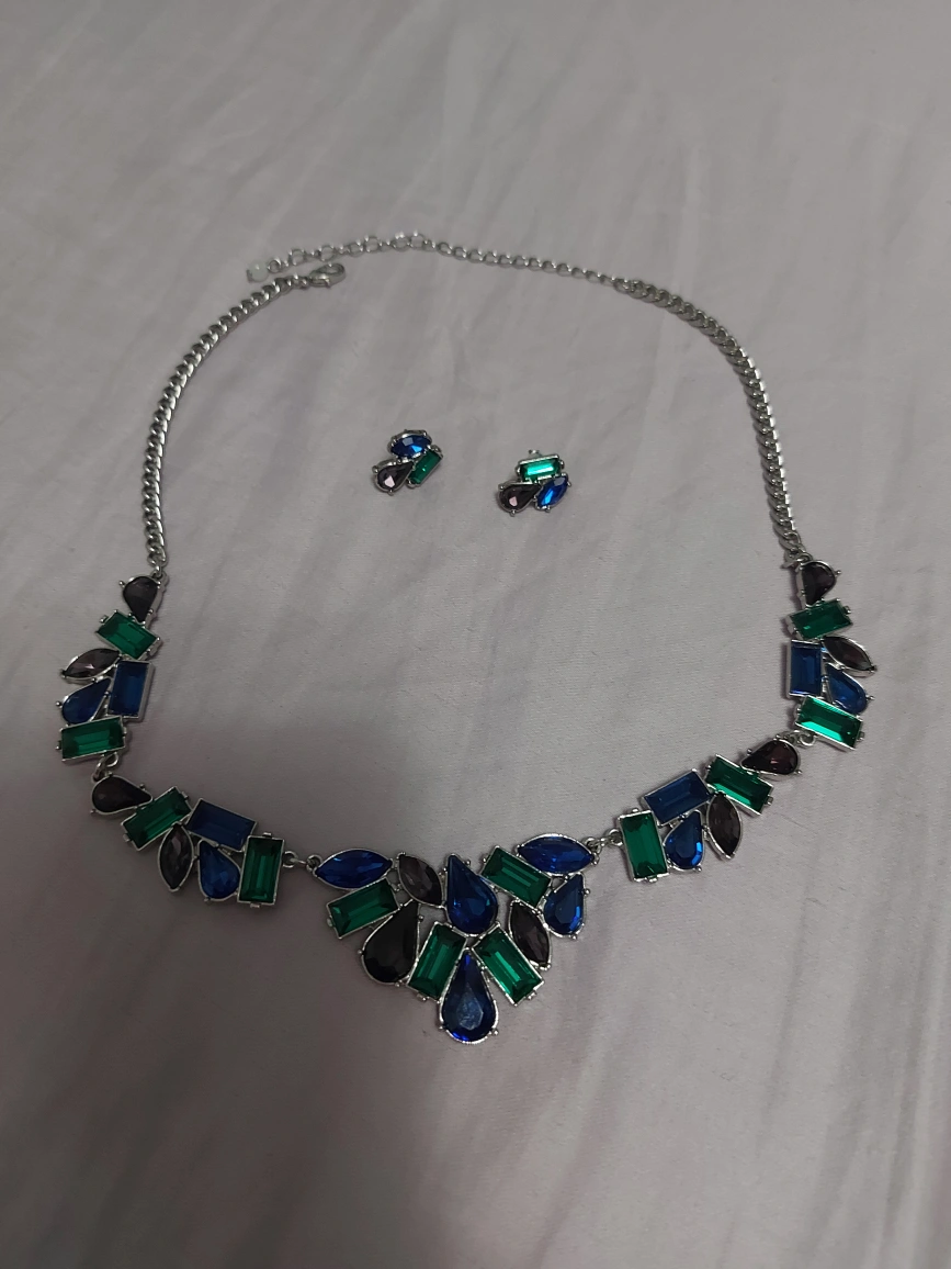 167Necklace and earrings set with green and blue gemstones. Silvertone chain. -Never worn