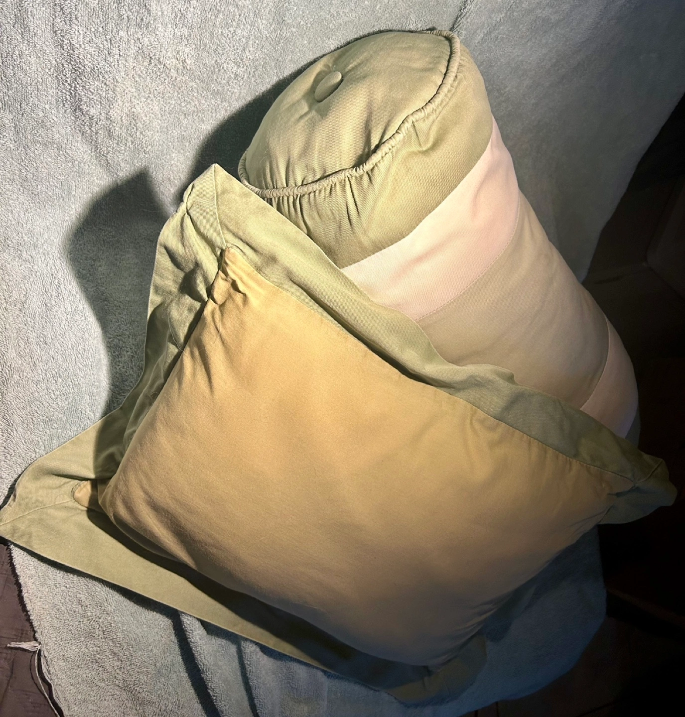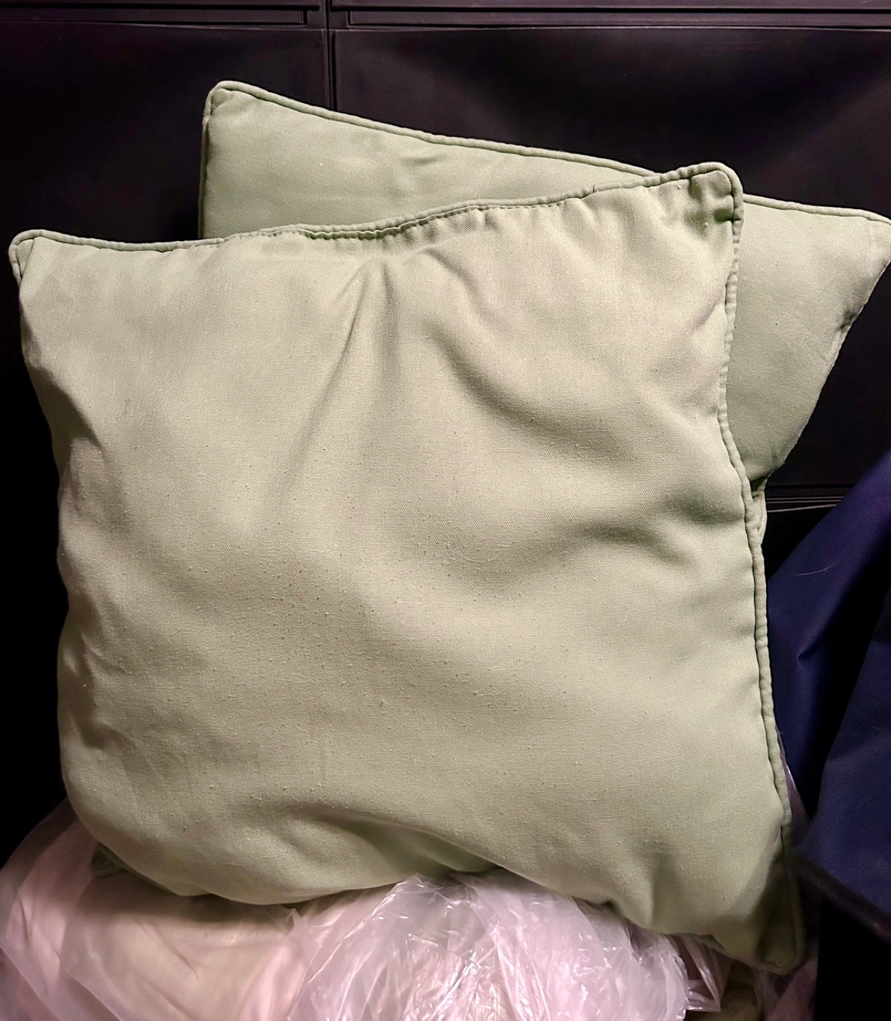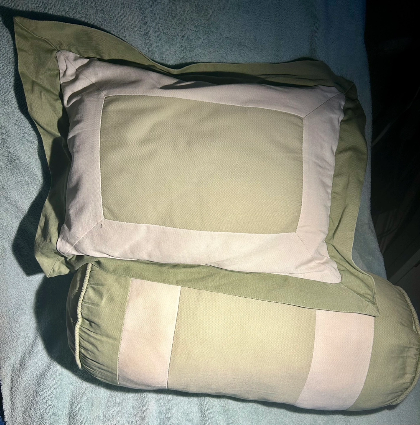 Set of four decorative pillows, two bigger square, one rectangular, one bolster shaped. Both feature green and white fabric. Perfect condition. Moving sale. See my other items. Pick up in Rundle, NE Calgary. If listed it is still available!