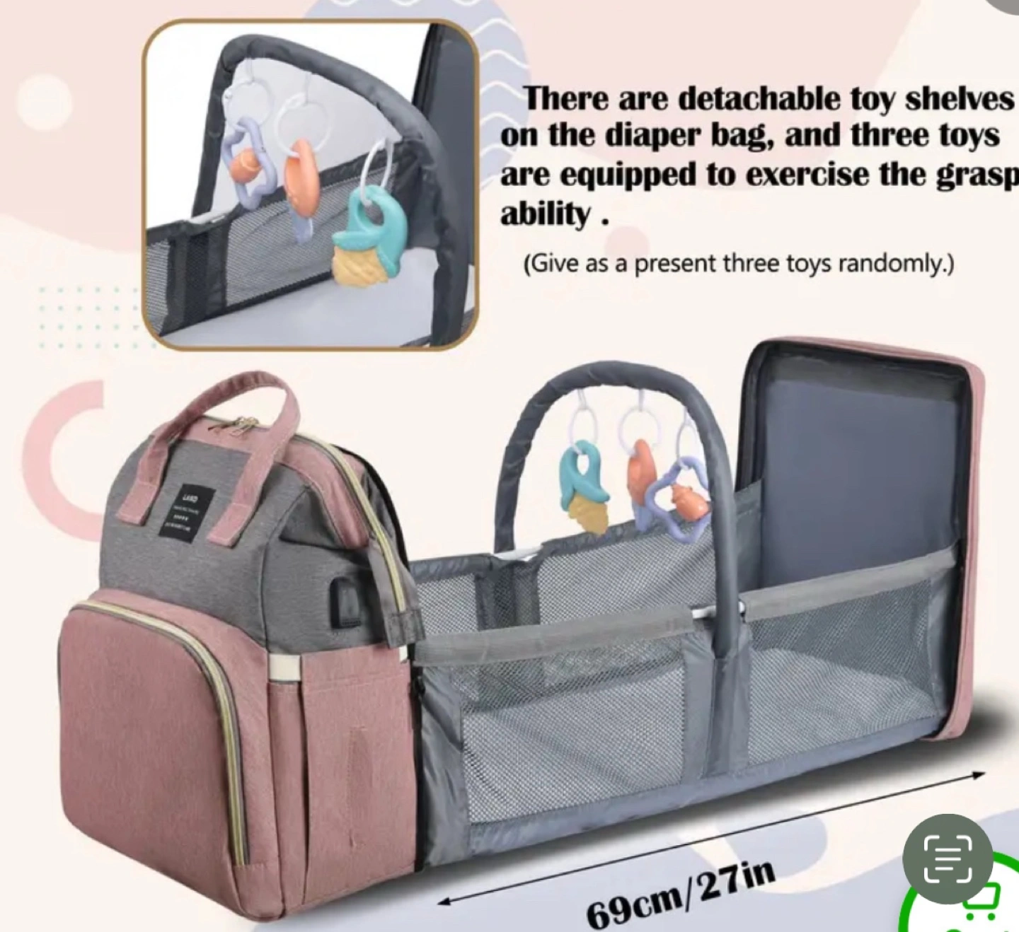 10Diaper bag backpack with built-in portable crib. Features several pockets, a changing mat, and a detachable toy shelf. Includes three toys.