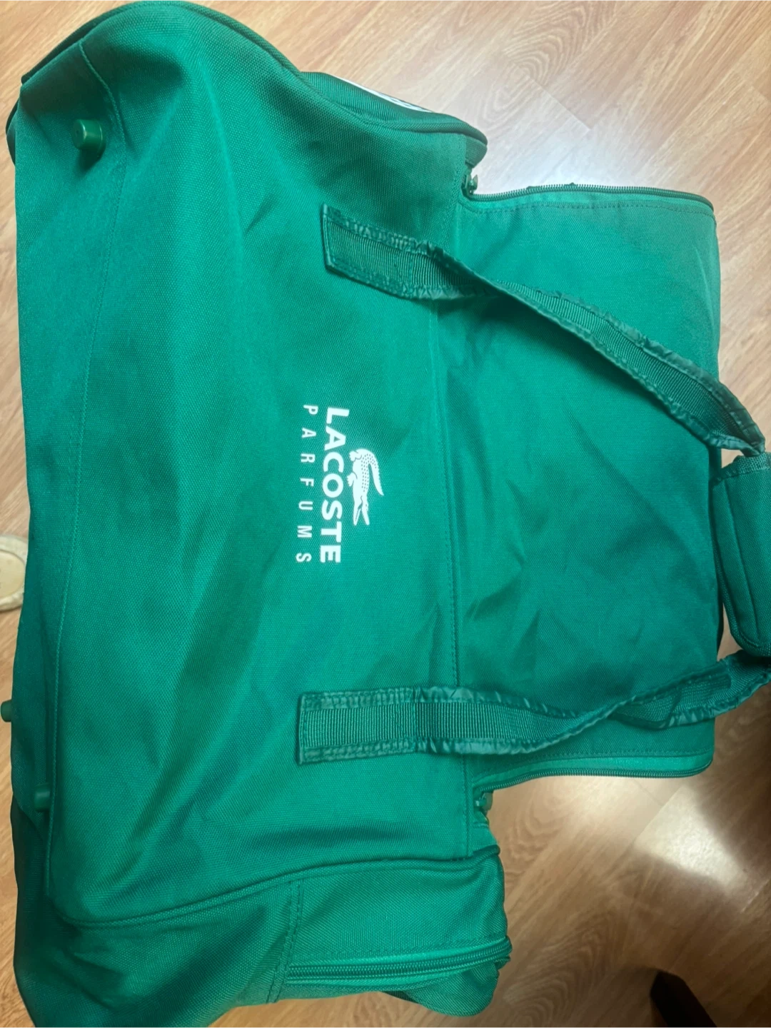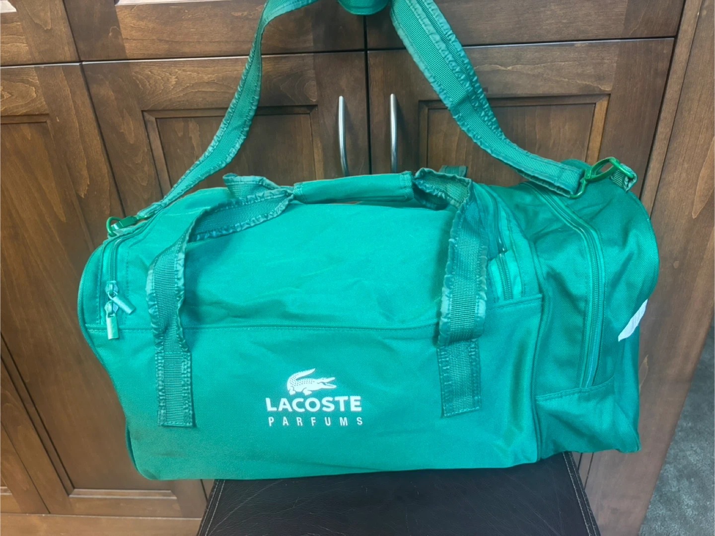 Selling a green Parfums duffle bag. It's in great shape and ready for your next adventure or trip to the gym! The bag features the iconic crocodile logo and 'ESSENTIAL' printed on the side. It's a stylish and functional bag! Features Main zipper compartment plus separate shoe compartment, shoulder strap and carry handle.