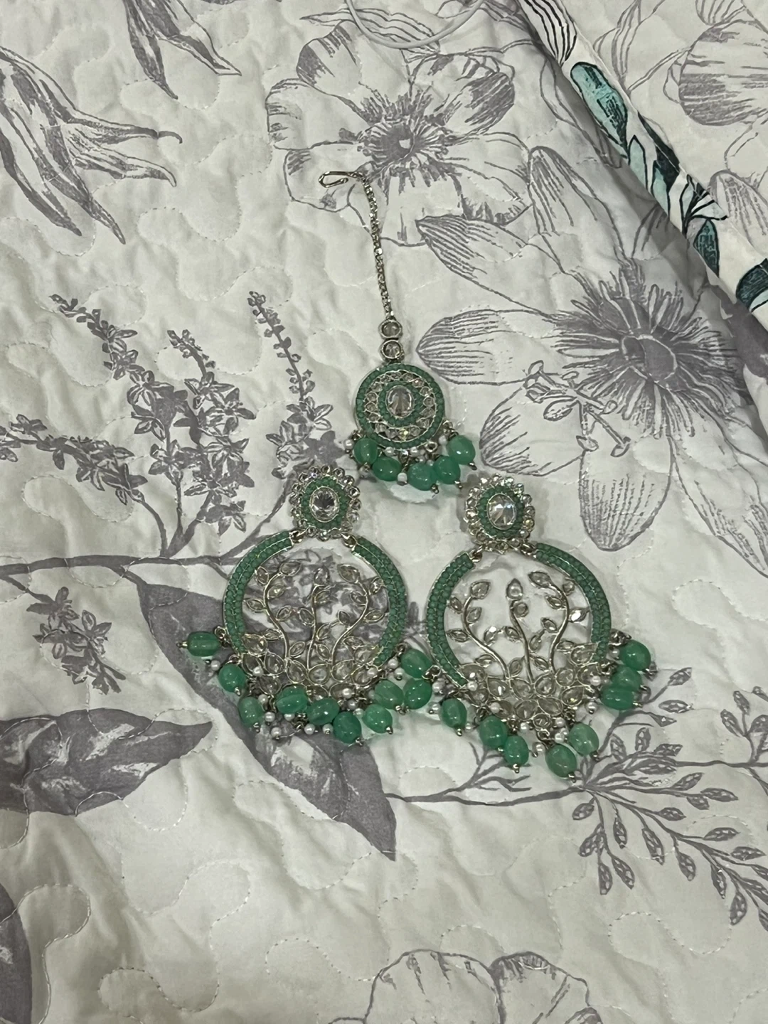 10Selling a beautiful set of earrings and tikka. The set features a lovely green colour and intricate detailing. Perfect for adding a touch of elegance to any outfit!