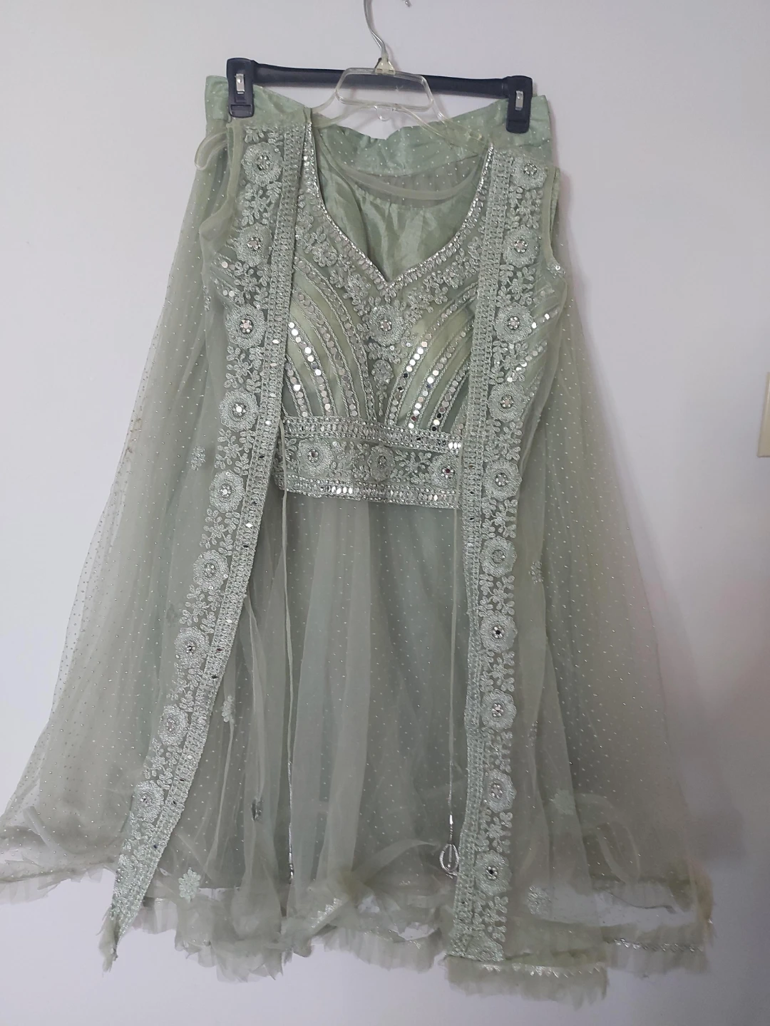 75Selling a beautiful green Indian outfit. It features intricate embellishments and a delicate design. Perfect for special occasions!