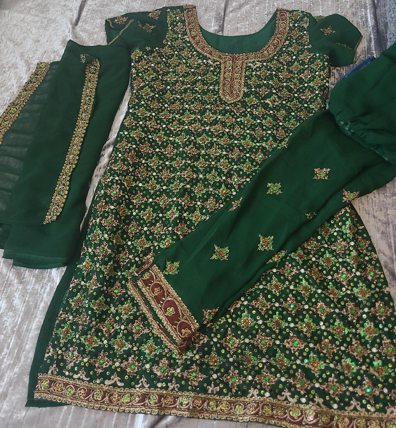 Beautiful green salwar kameez suit with intricate embroidery. Includes the kameez (top), salwar (pants), and dupatta (scarf). Perfect for special occasions!