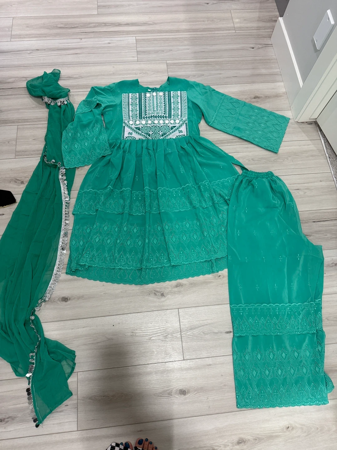 56Beautiful green shalwar kameez with intricate embroidery. Includes the kameez (top), shalwar (pants), and dupatta (scarf). Perfect for special occasions or cultural events