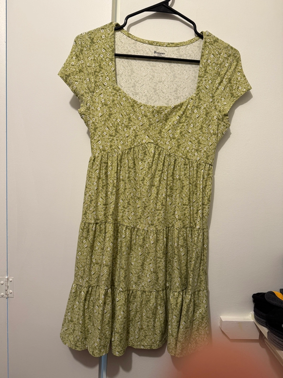 Cute green floral dress. It's in great condition and features a tiered design. Perfect for a sunny day out or a casual get-together