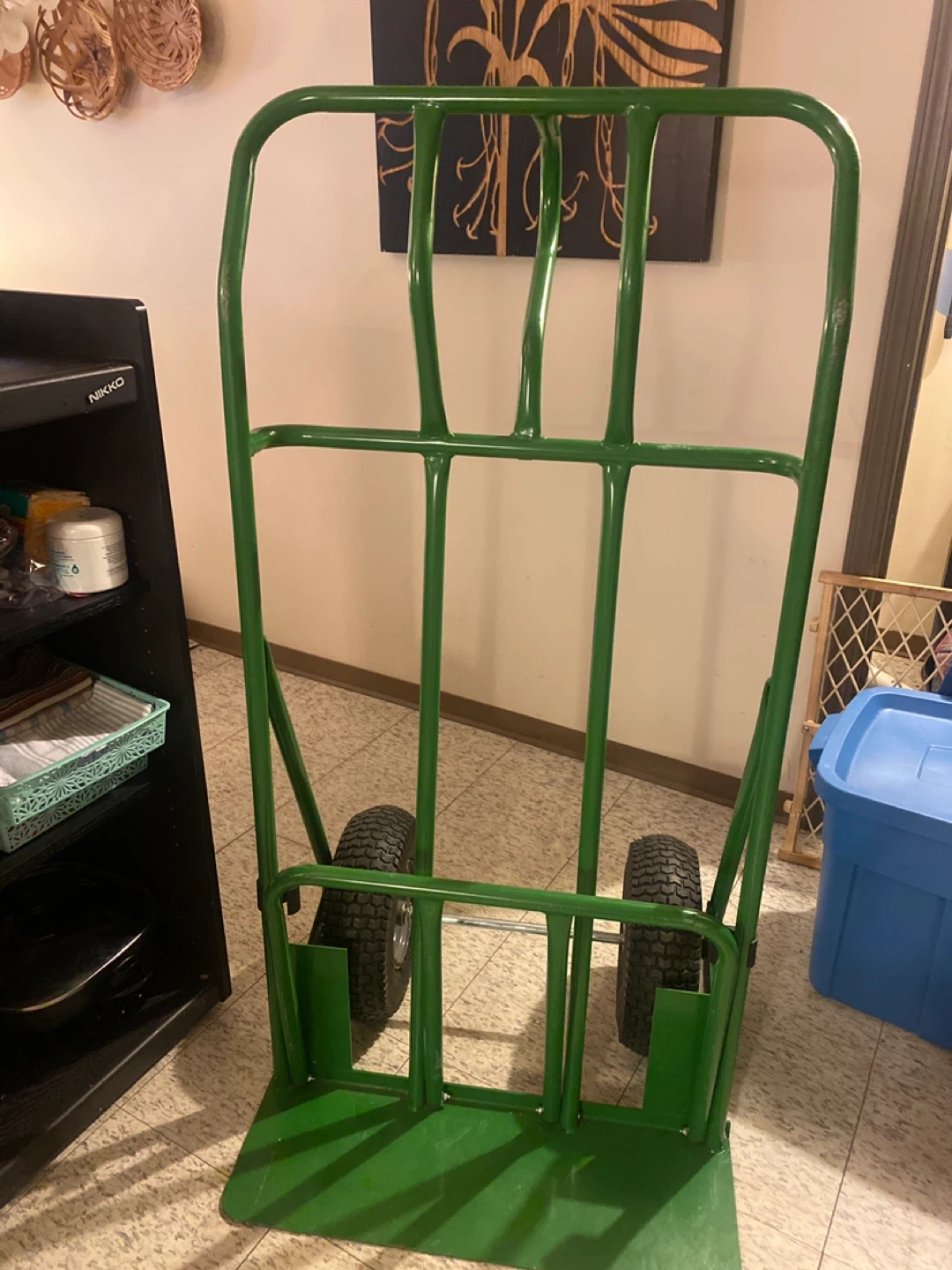 Selling a green hand truck dolly. It's perfect for moving heavy items around the house or workplace. It has a sturdy frame and durable wheels, ready to help with your moving needs!