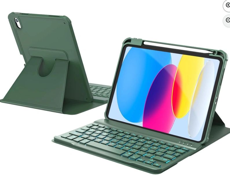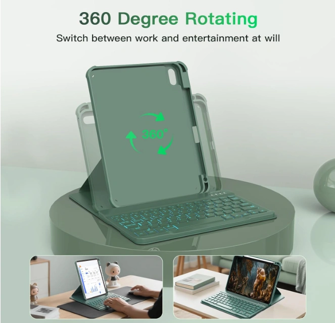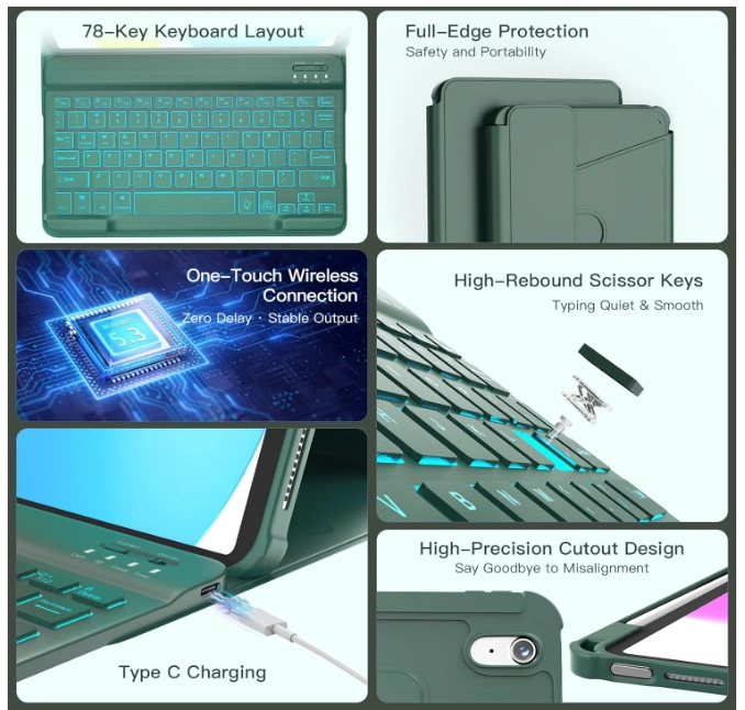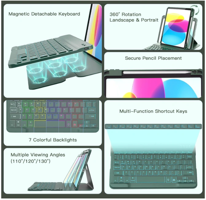 This green keyboard case is designed for the iPad 10th generation. It features: - 360-degree rotation for flexible viewing - A magnetic detachable keyboard - 7 colorful backlights - Multiple viewing angles (110°/120°/130°) - One-touch wireless connection with Bluetooth 5.3 - High-rebound scissor keys for quiet and smooth typing - Full-edge protection for safety and portability - Precise cutouts for easy access to ports