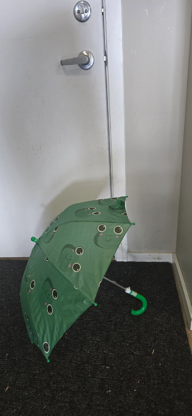 Selling a cute green umbrella designed for kids! It features a fun pattern of smiling faces. Perfect for keeping your little one dry on rainy days