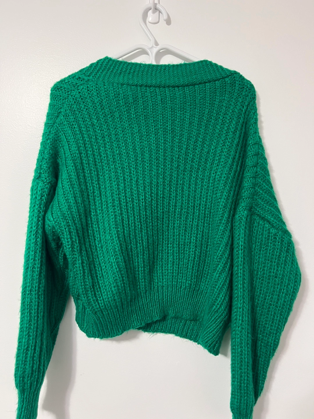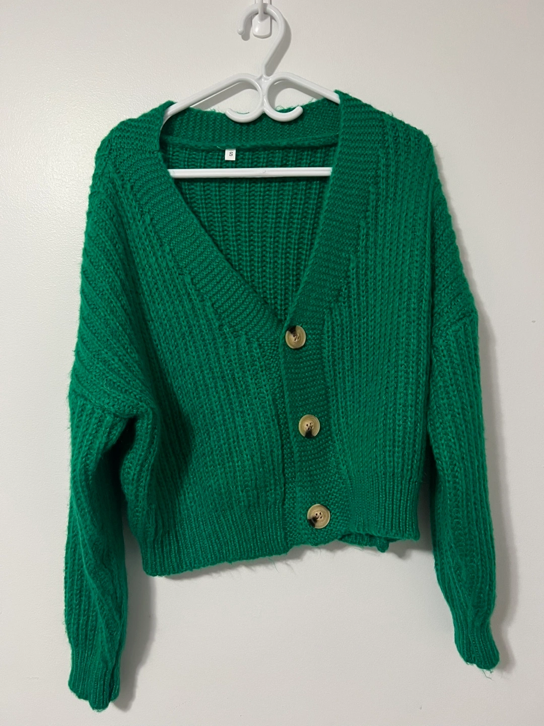71Selling a cozy green knit cardigan in size small fits M-L. It features a V-neck and button-up design. Perfect for layering or wearing on its own. In great condition!