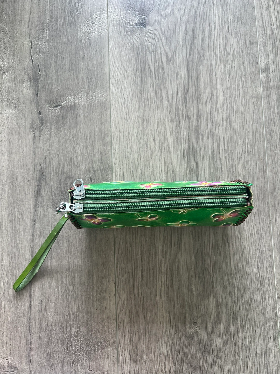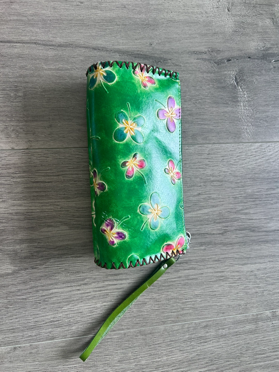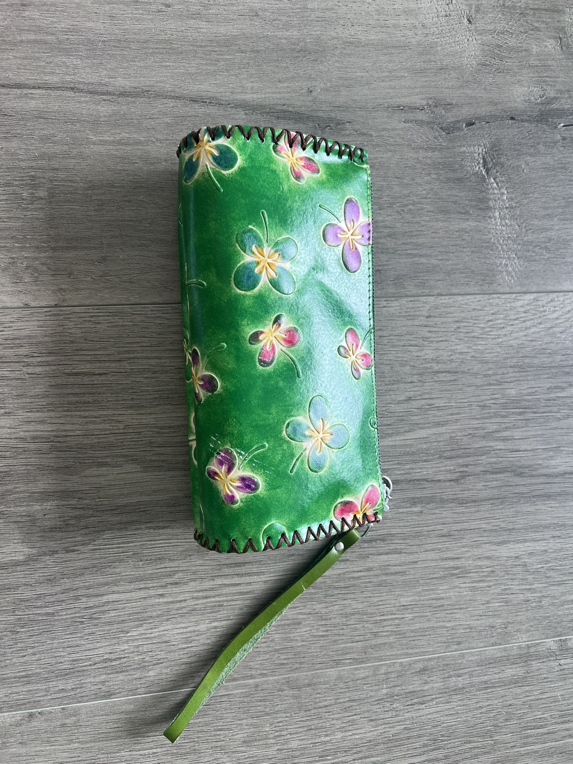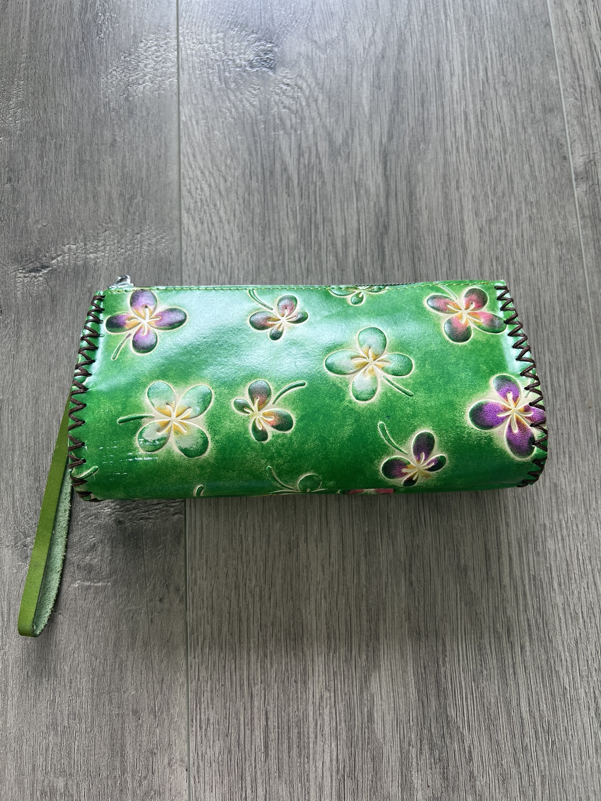 170A green real leather clutch with a floral design. The clutch has two zippers. It comes with a wrist strap. One of a kind