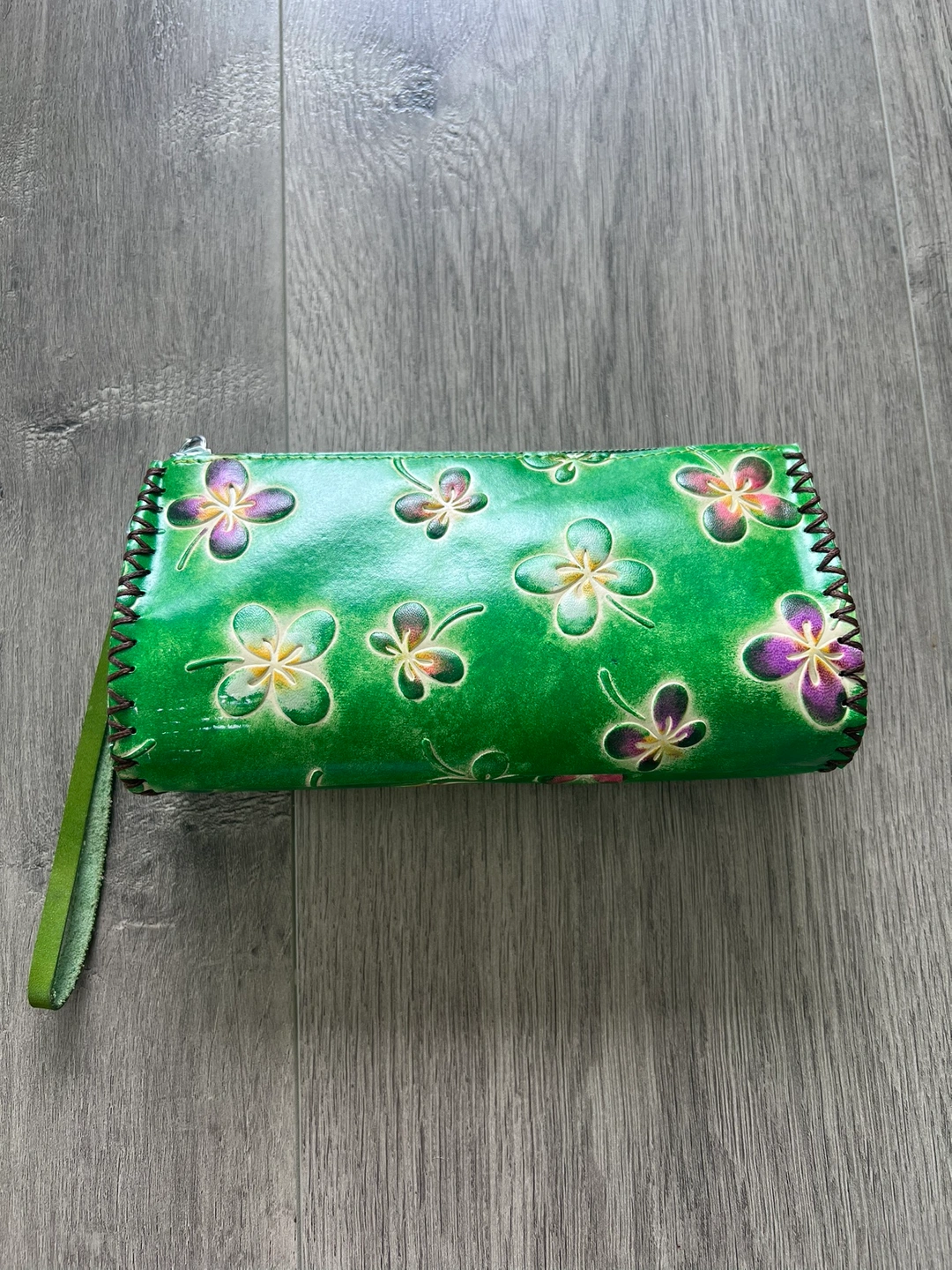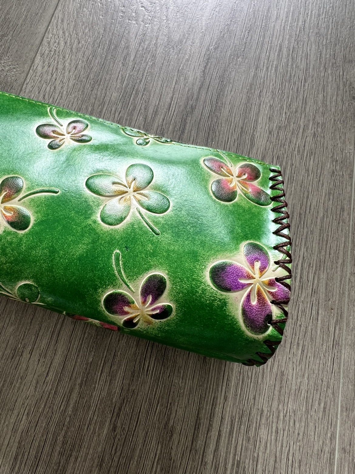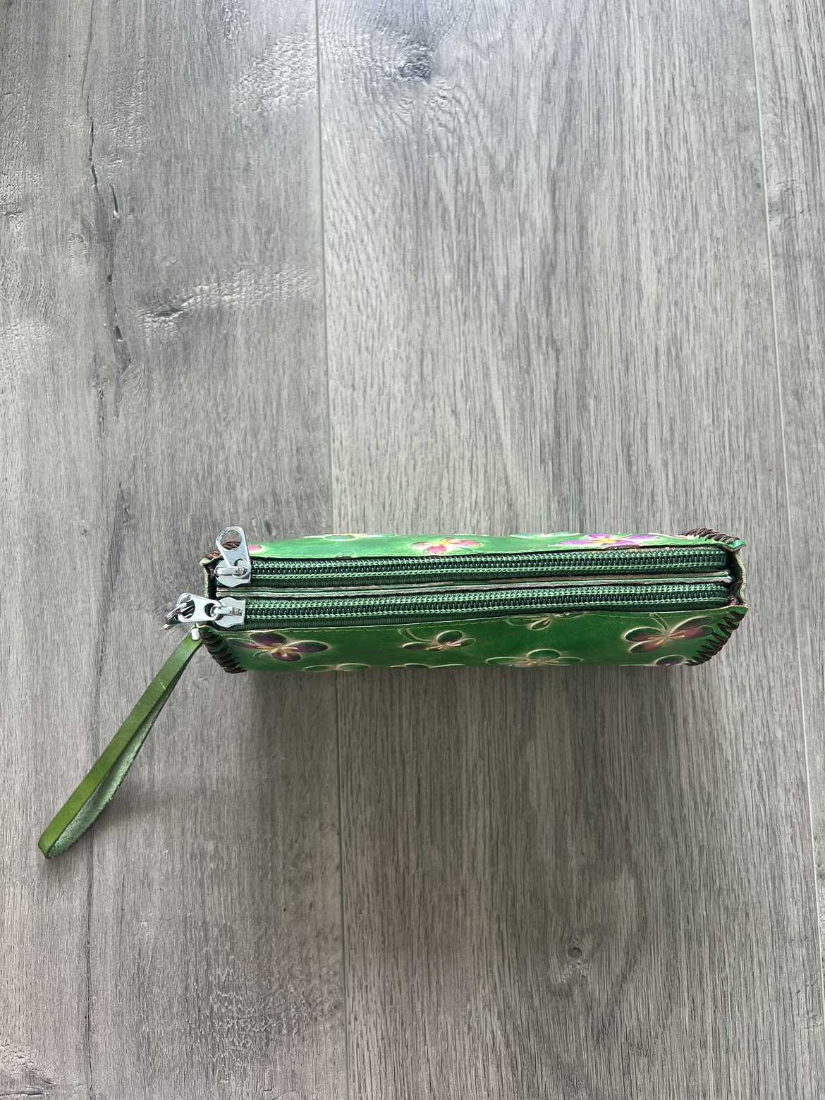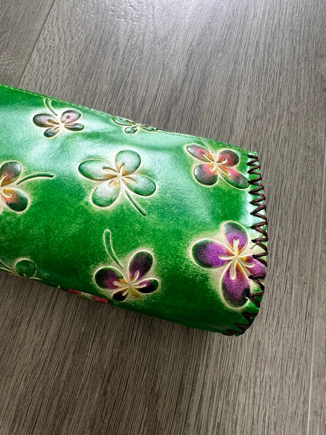 170A green real leather clutch with a floral design. The clutch has two zippers. It comes with a wrist strap. One of a kind