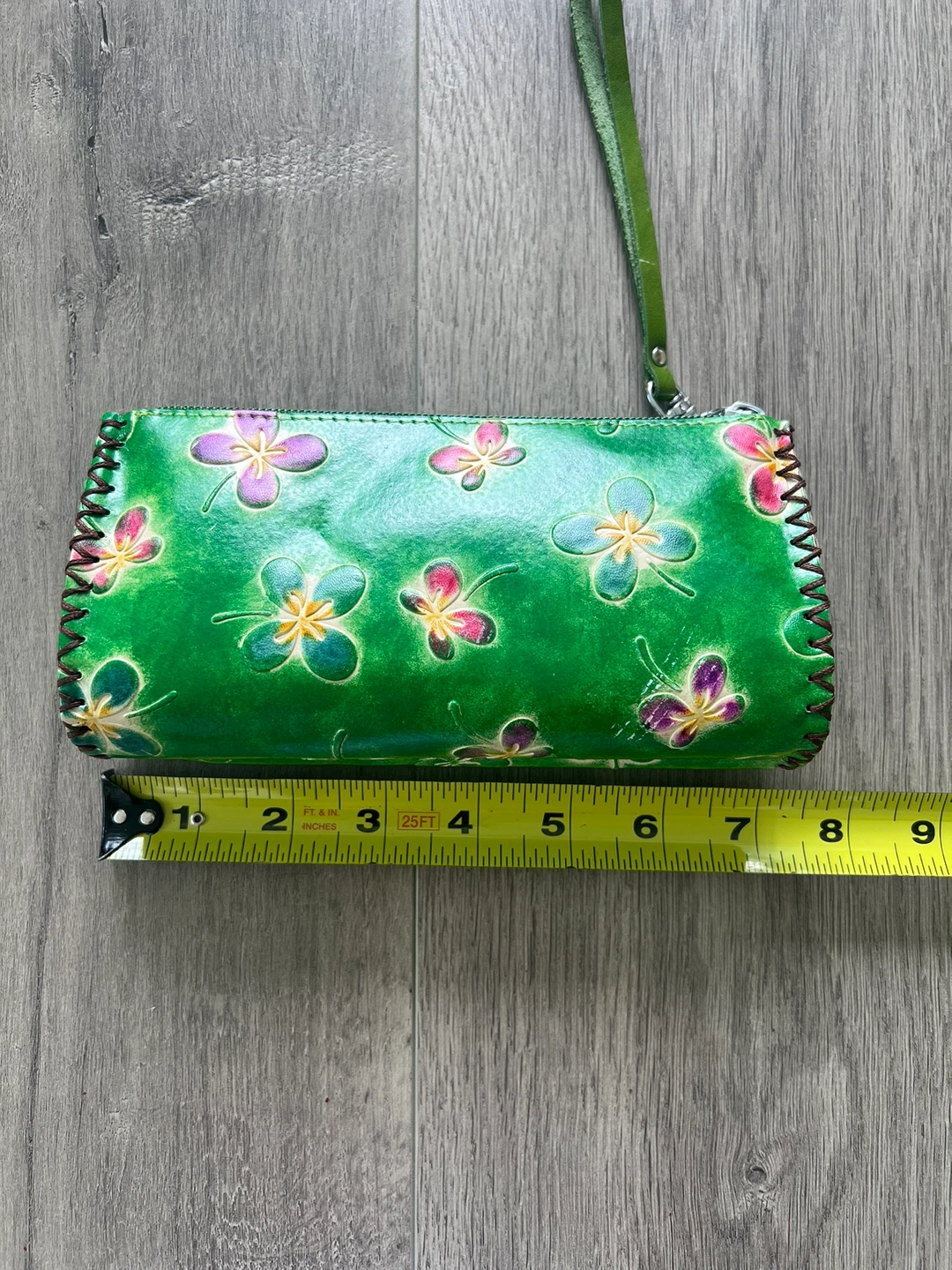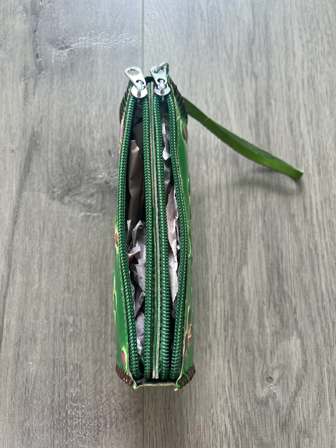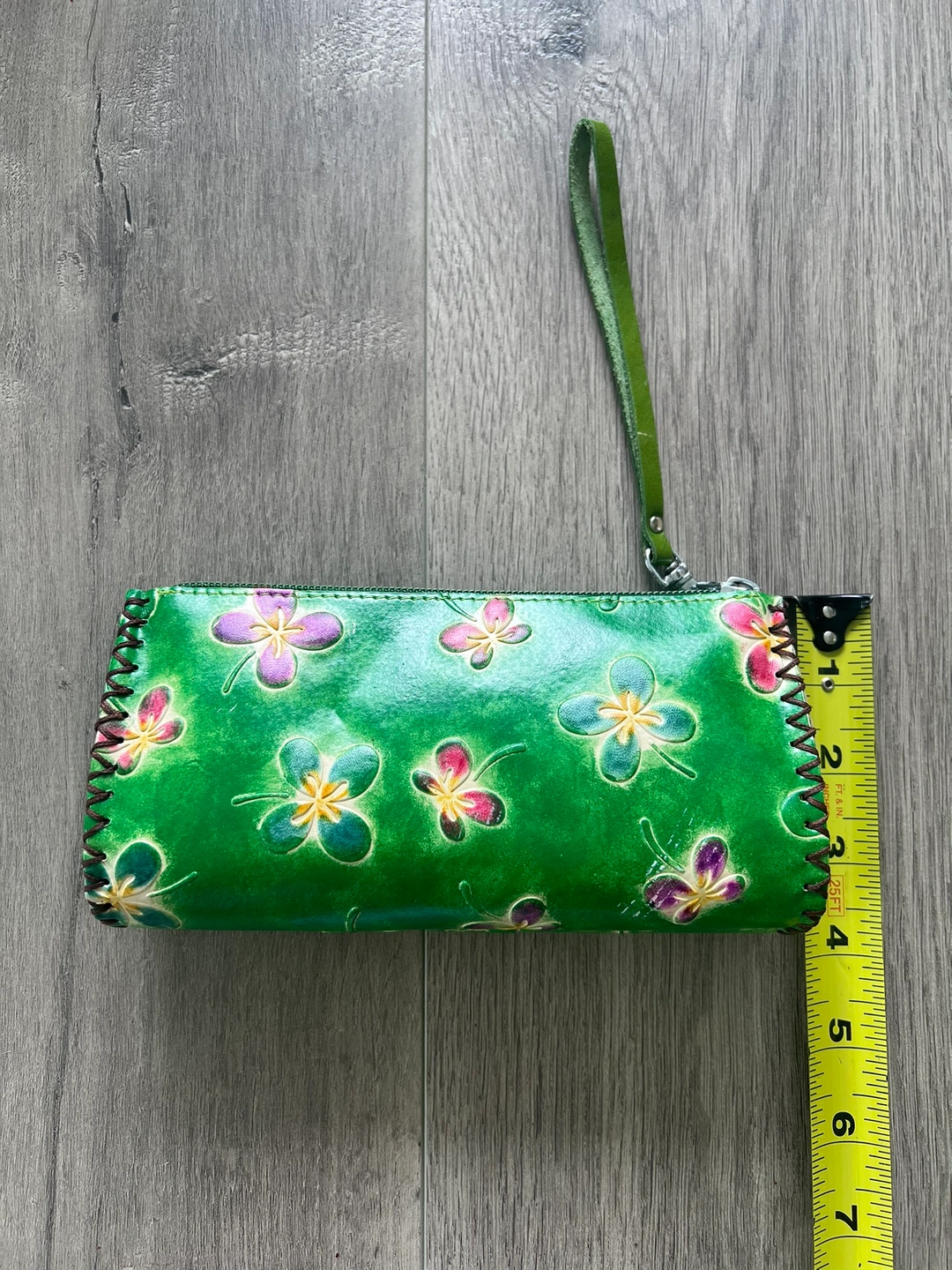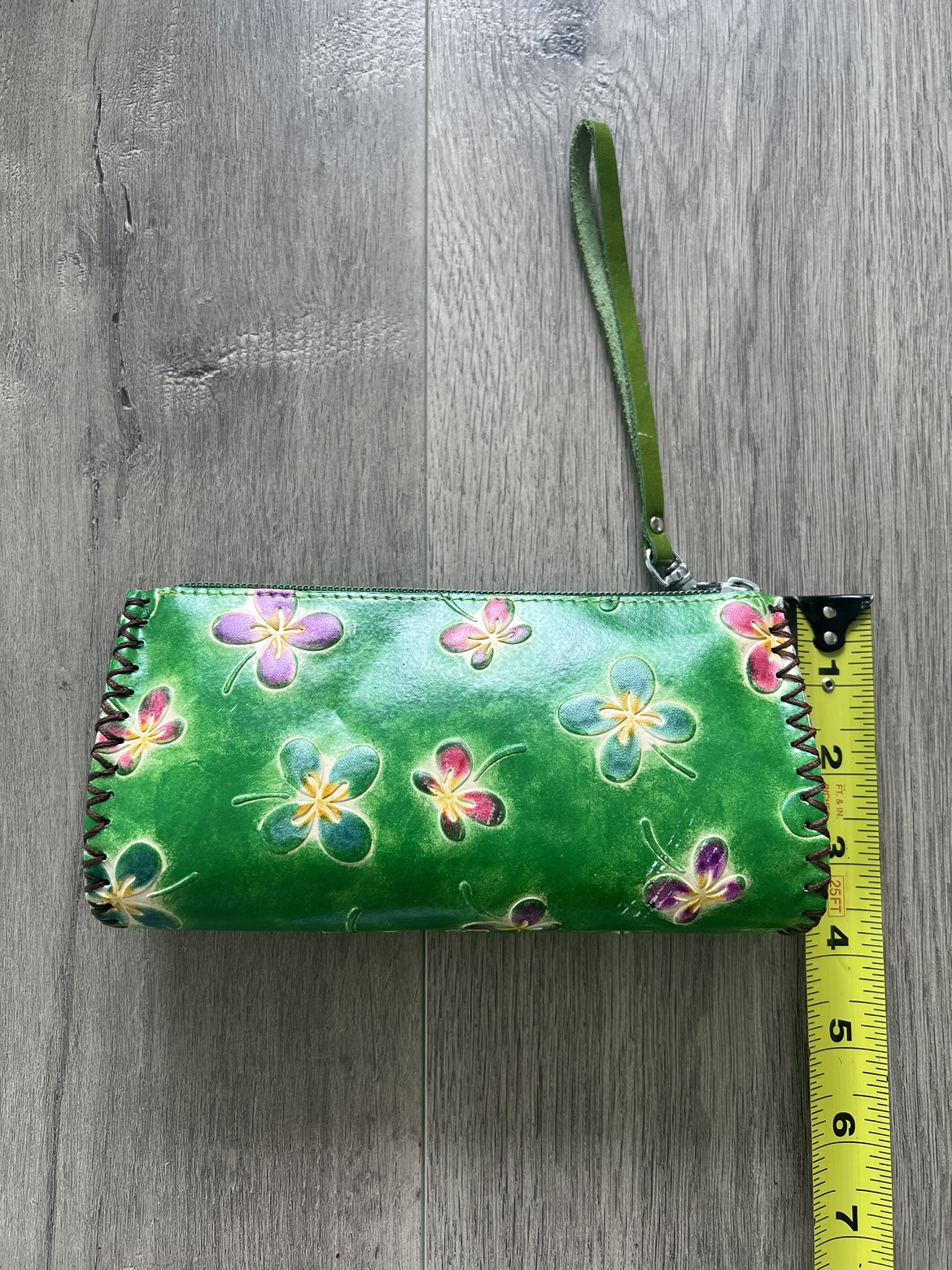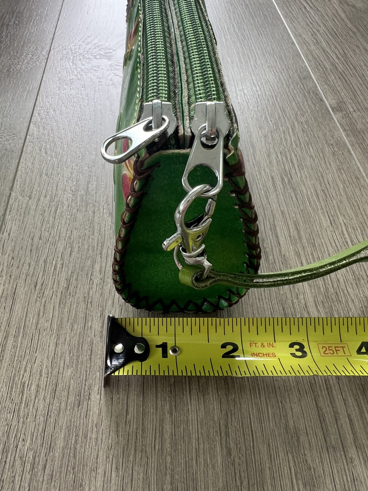 170A green real leather clutch with a floral design. The clutch has two zippers. It comes with a wrist strap. One of a kind