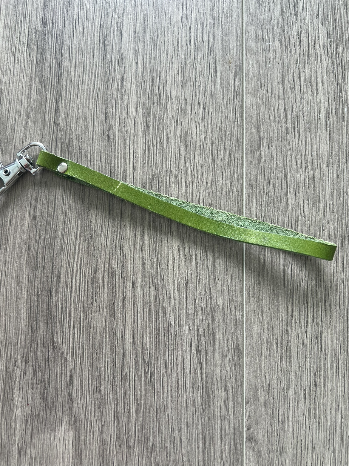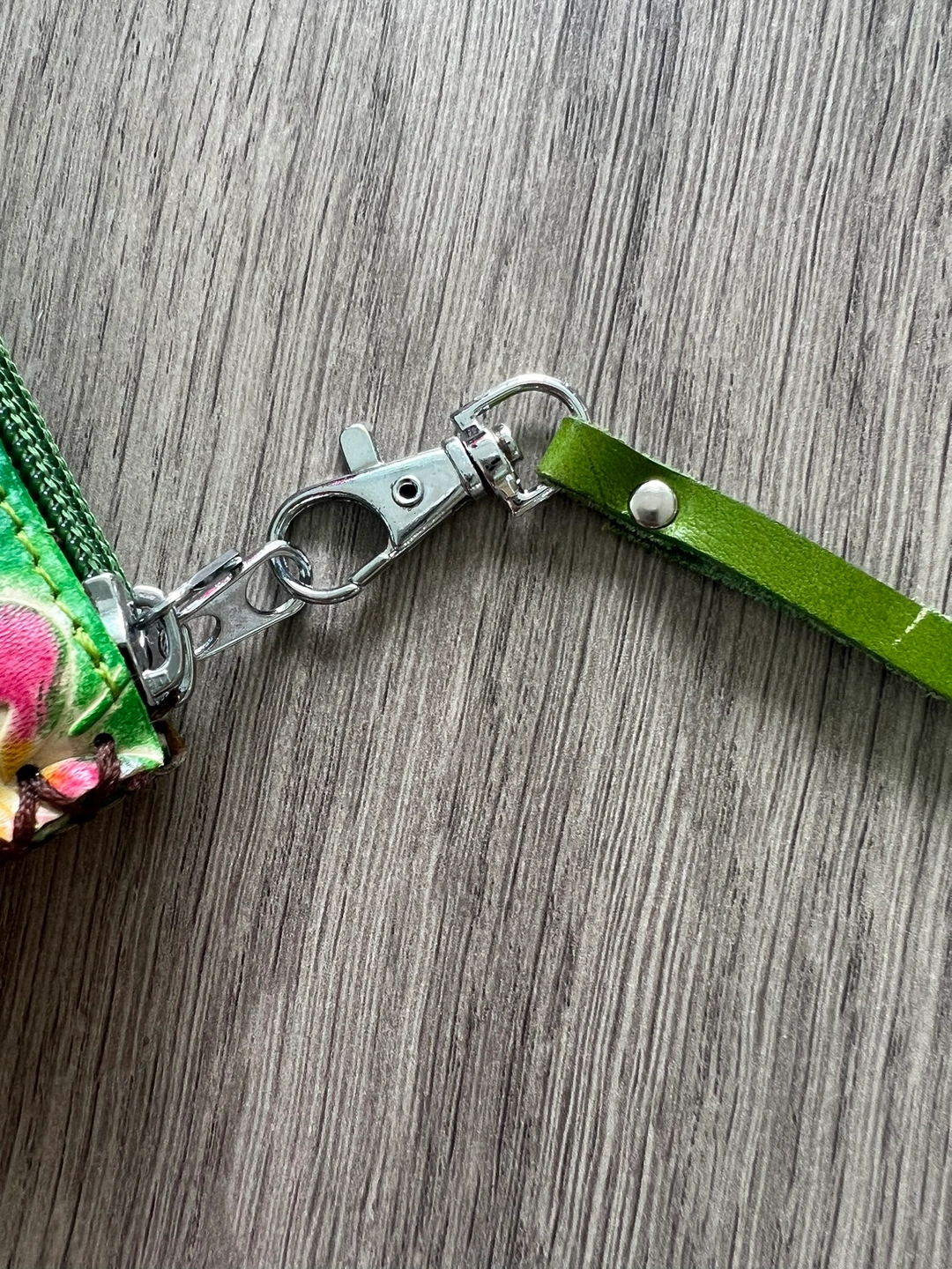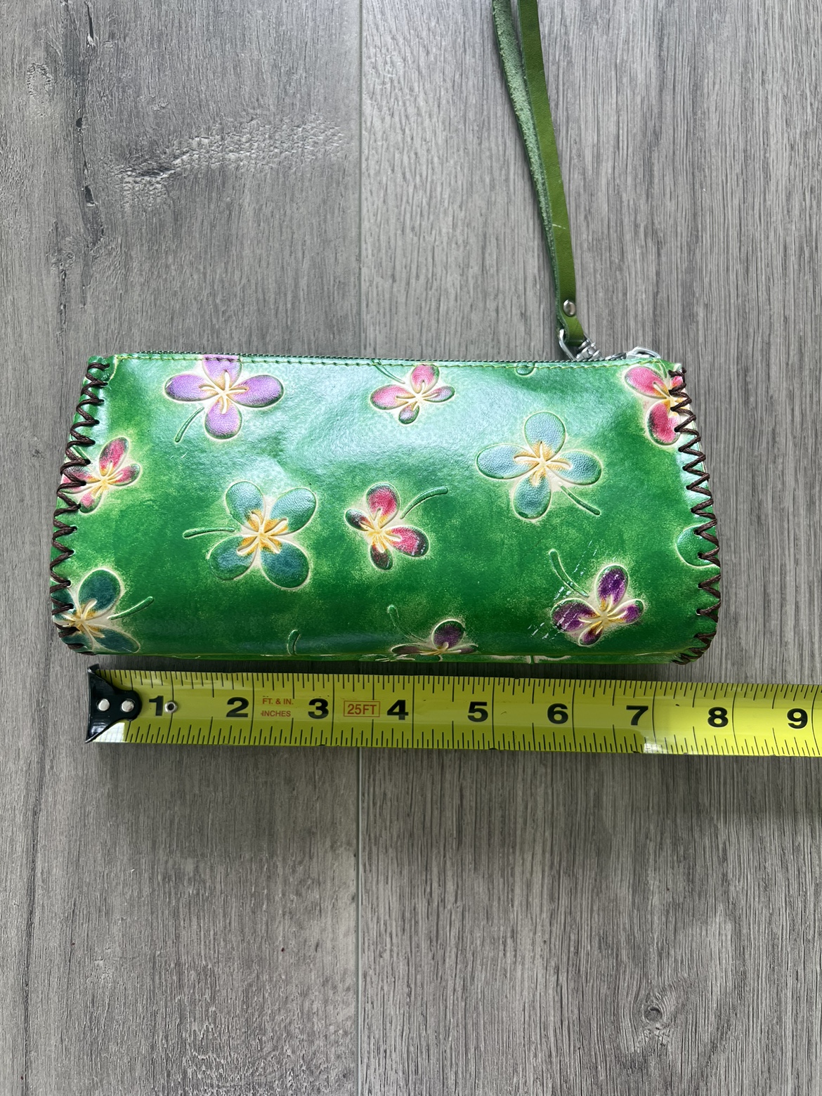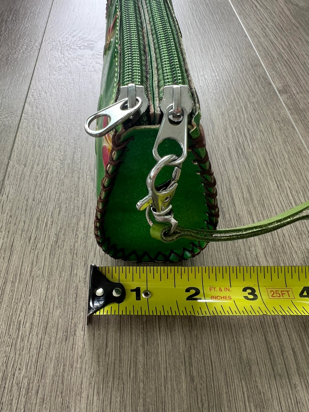 170A green real leather clutch with a floral design. The clutch has two zippers. It comes with a wrist strap. One of a kind