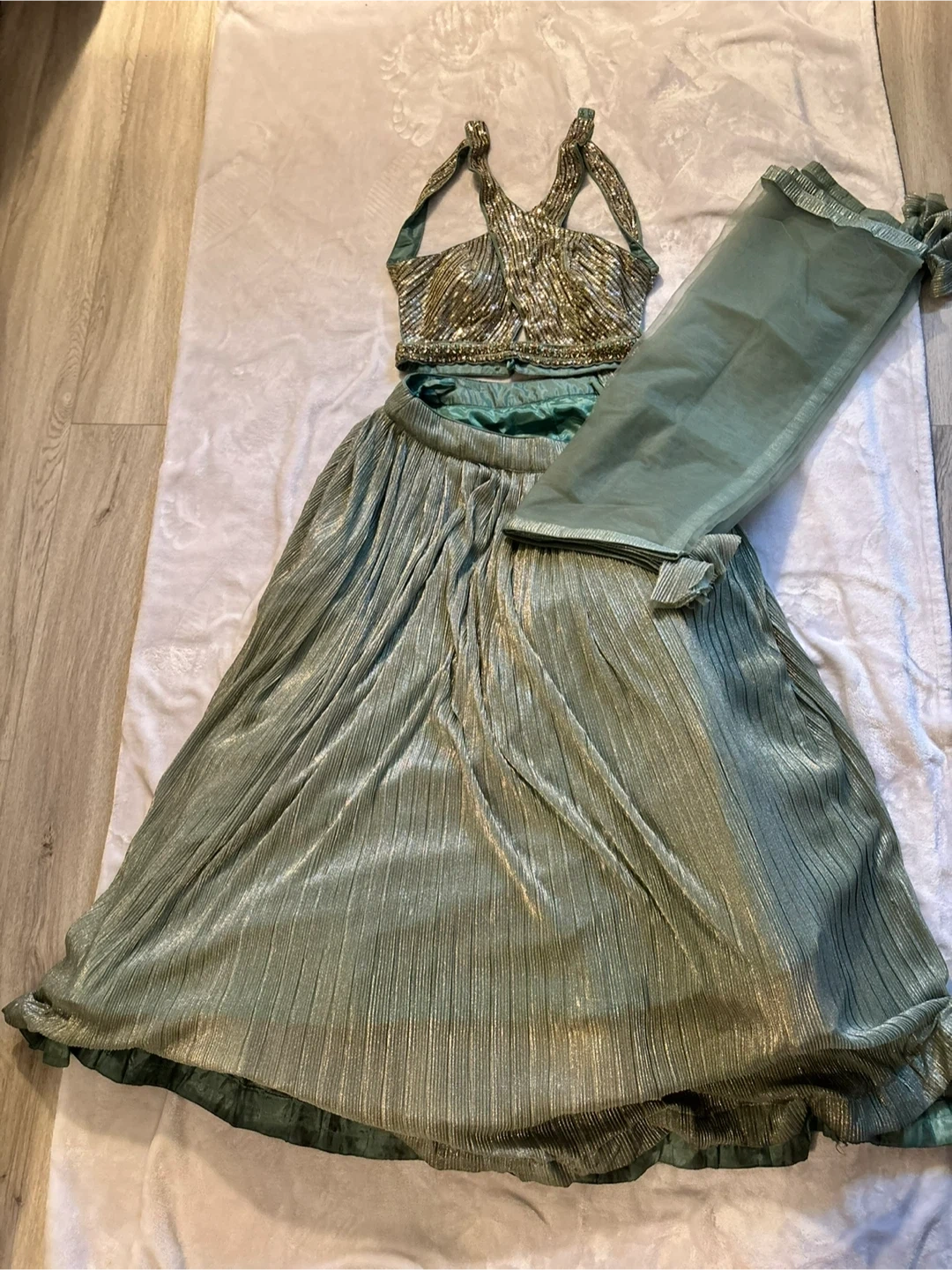 10Selling a beautiful green lehenga choli set. The fabric has a lovely shimmer and the design is very elegant. Perfect for a special occasion!