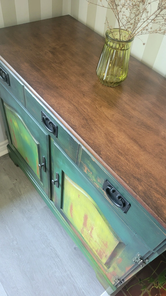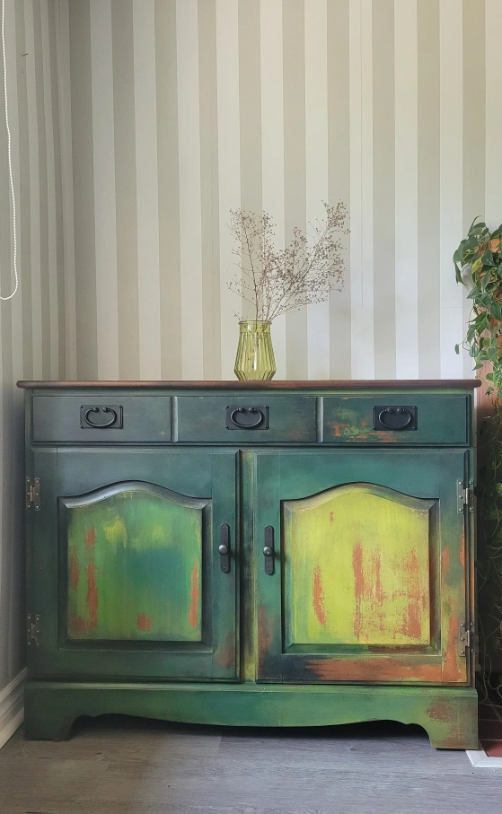 This is a unique cabinet with a painted green finish and a wood top. It would be a great addition to any room and adds a touch of rustic charm to your home decor. The cabinet features drawers and doors for storage.