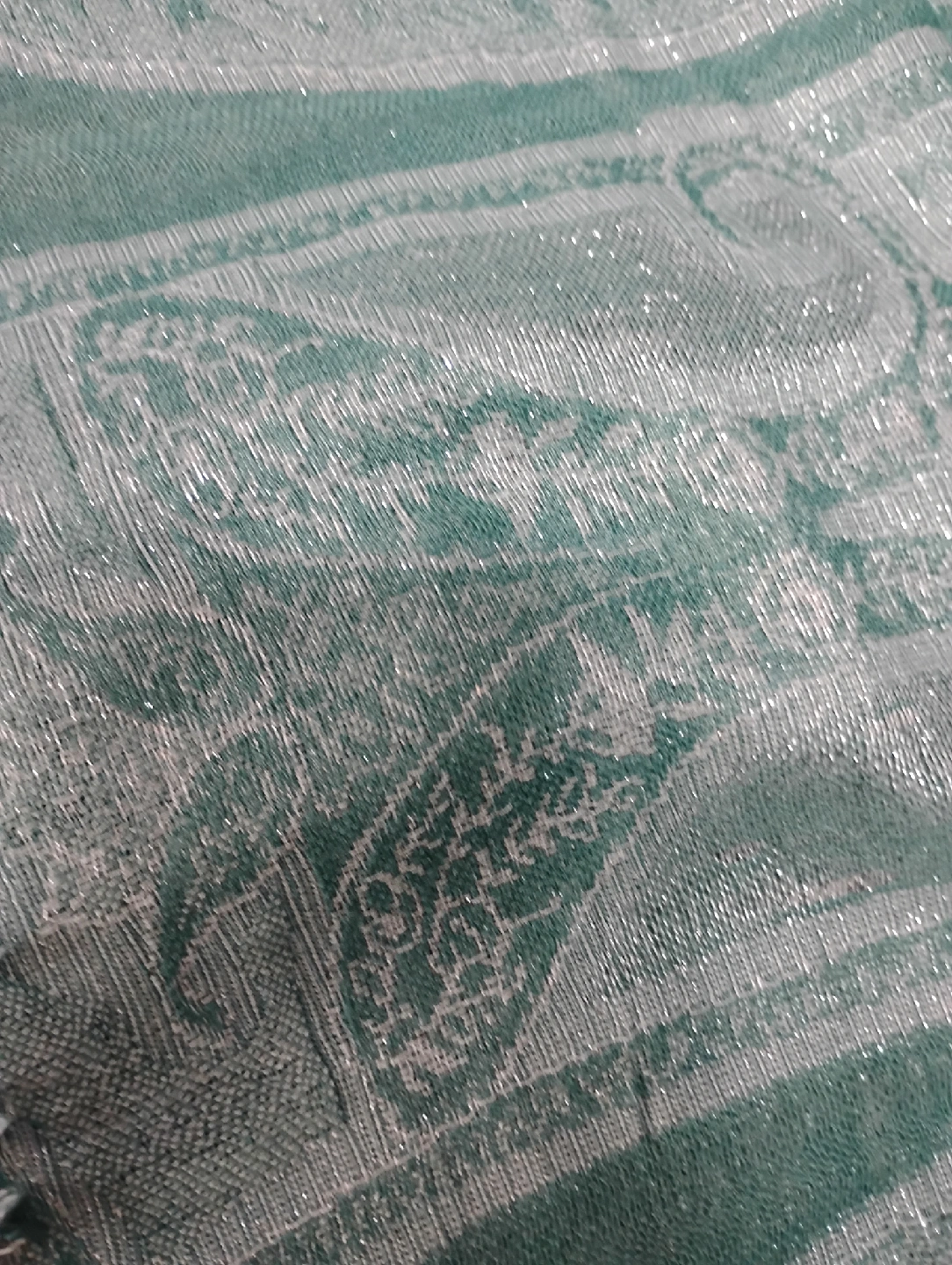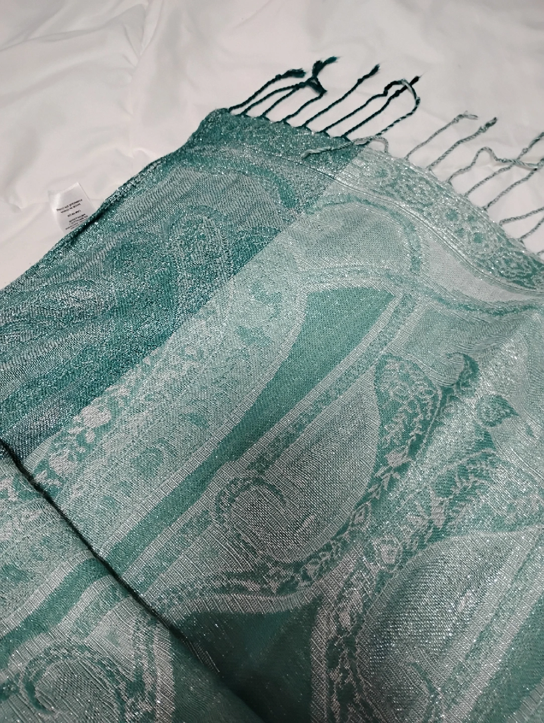 129A lovely green patterned scarf! The material is soft and has a beautiful shimmer to it. Perfect for adding a touch of elegance to any outfit