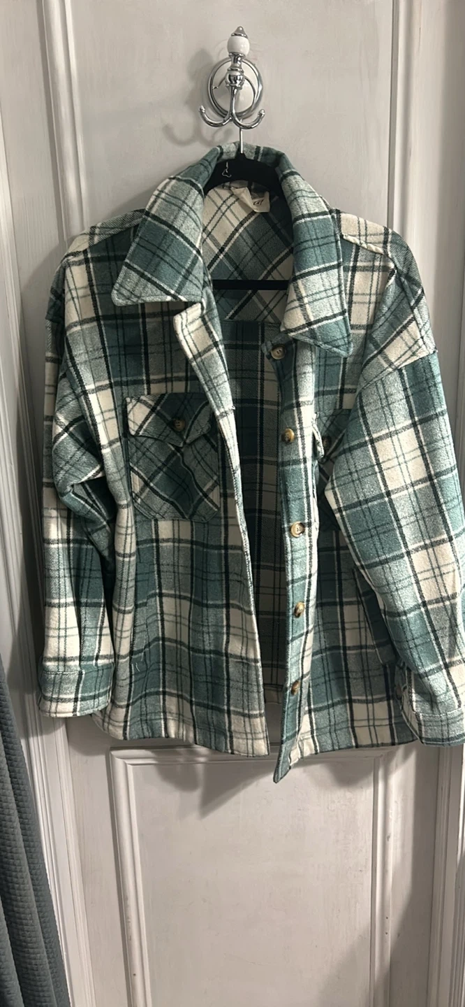 10Selling a comfy green plaid shacket. It's in great condition and perfect for layering during the cooler months! The material is soft and cozy, making it a great casual piece for everyday wear