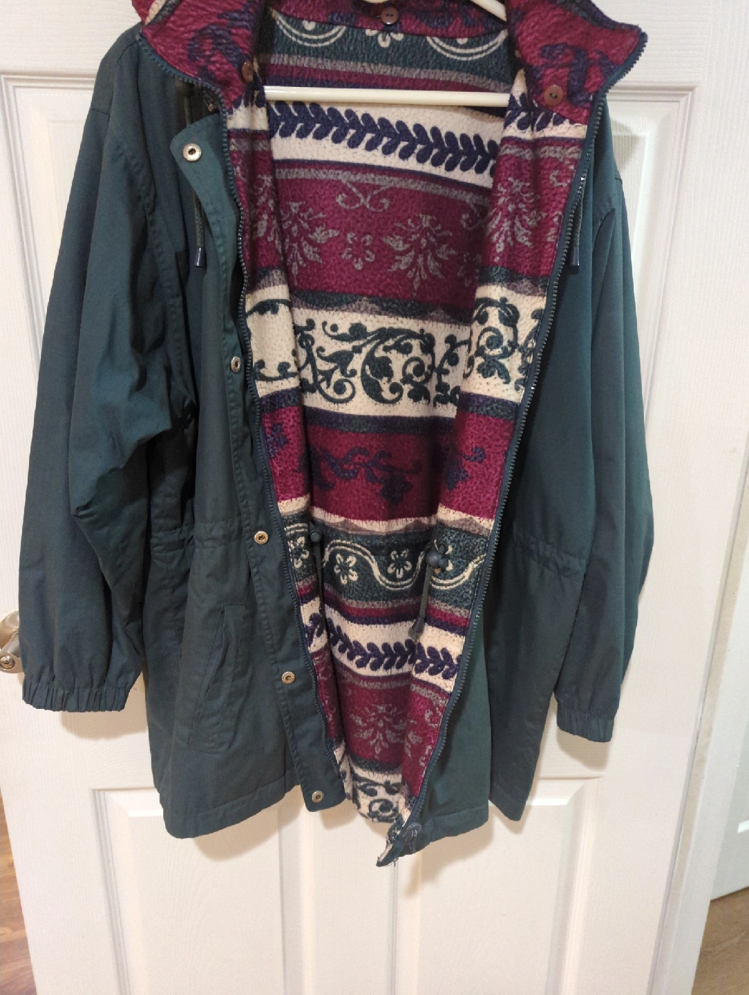 Here's a cozy green winter coat with a reversible lining! It has a unique pattern on the inside, making it stylish and warm for those chilly days. Perfect for staying snug and looking good!