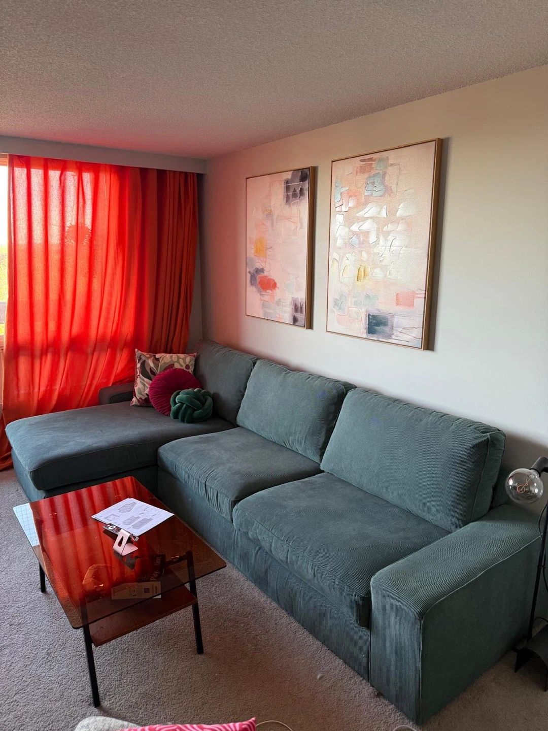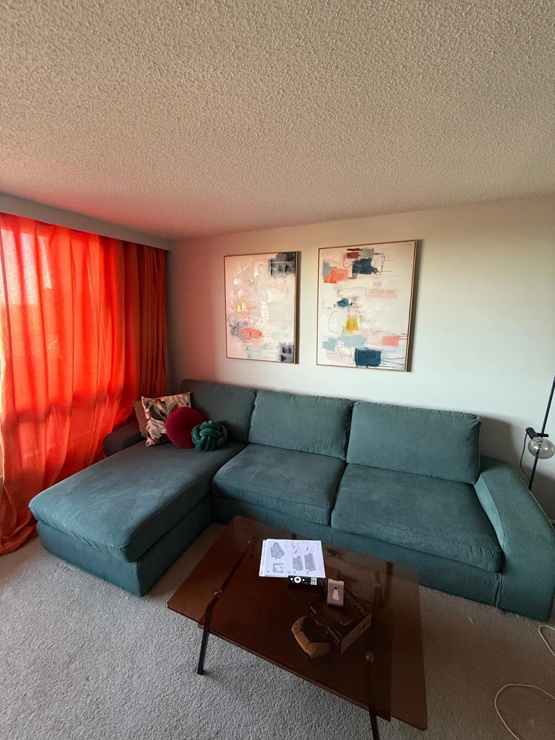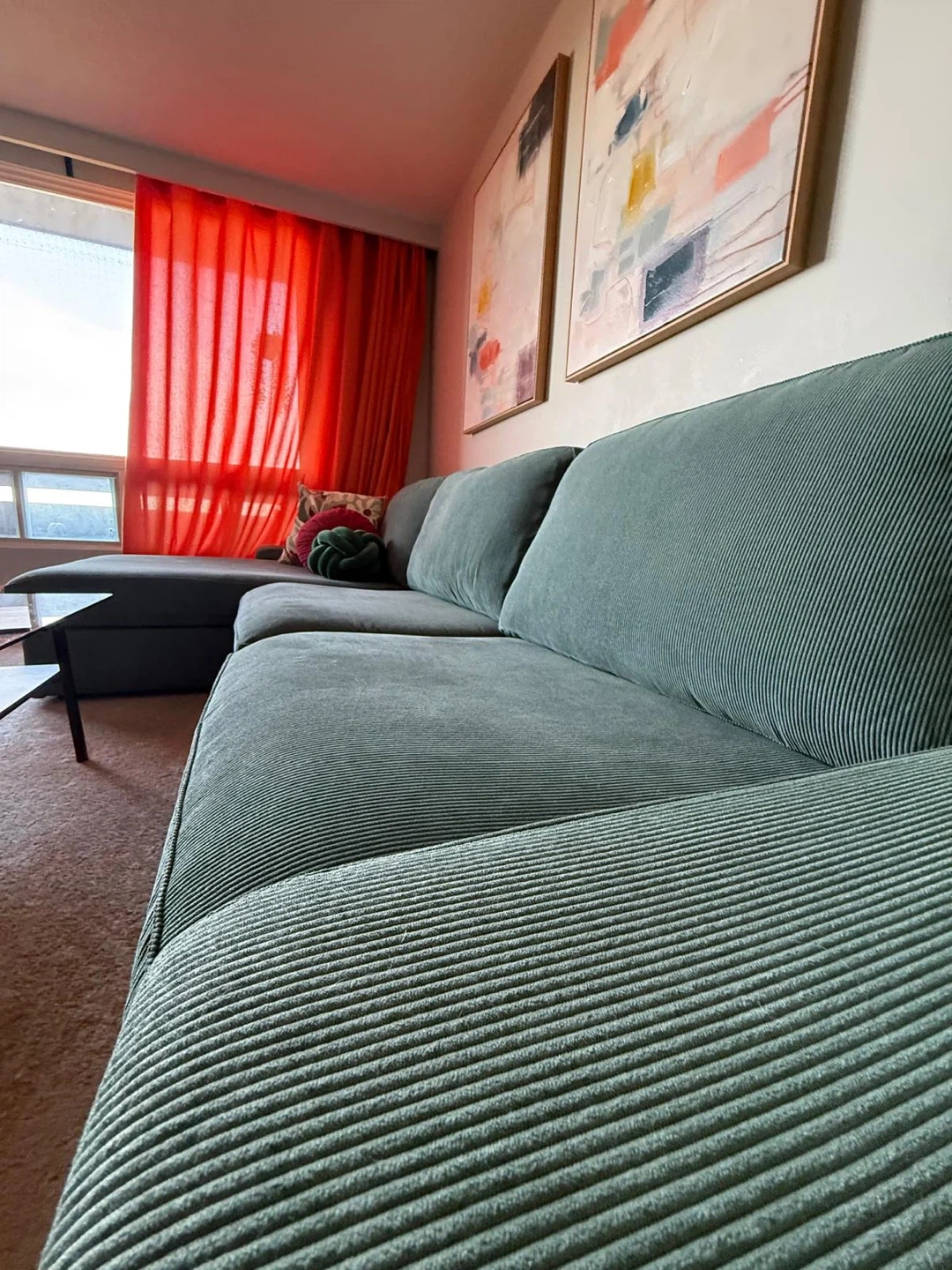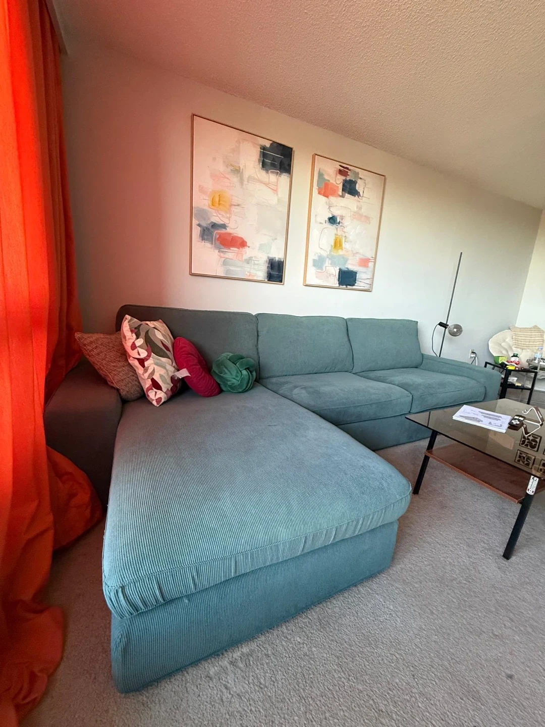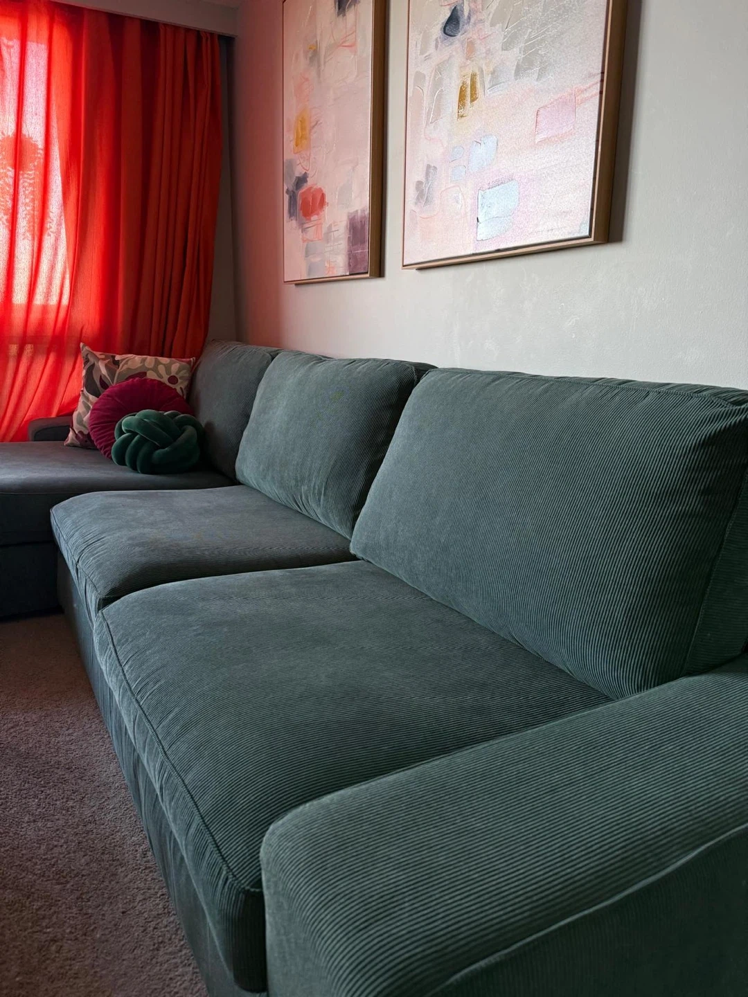 15Selling a comfy green corduroy sectional sofa. It's in great shape and perfect for a living room . The corduroy material gives it a nice texture and the green colour is quite stylish! Very good condition bought less than a year Selling because we are moving and it doesn’t fit in our new living room Cushions are removable and washable
