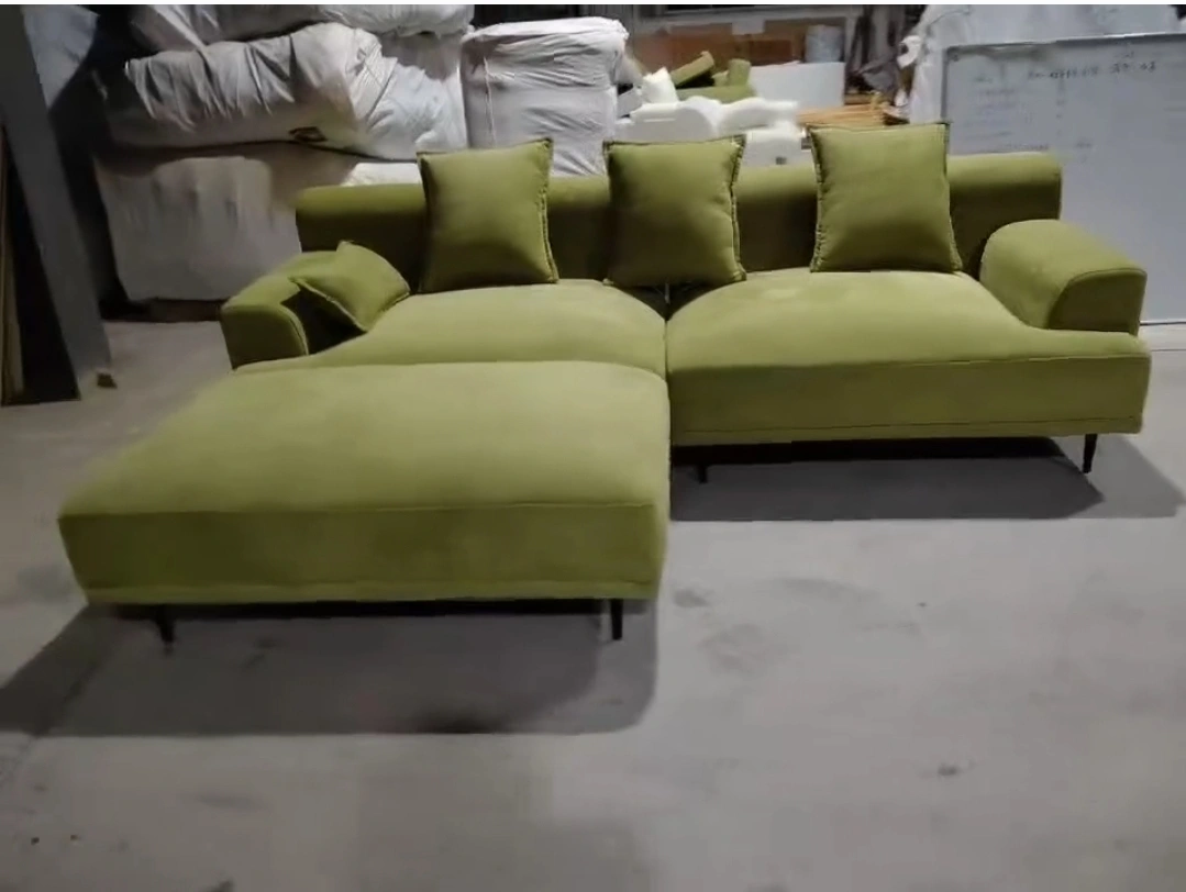 Selling a comfy green sectional sofa with a chaise lounge! It comes with a few matching pillows to complete the look. Perfect for a living room or den, providing lots of space to stretch out and relax. It's in great condition and ready for a new home!