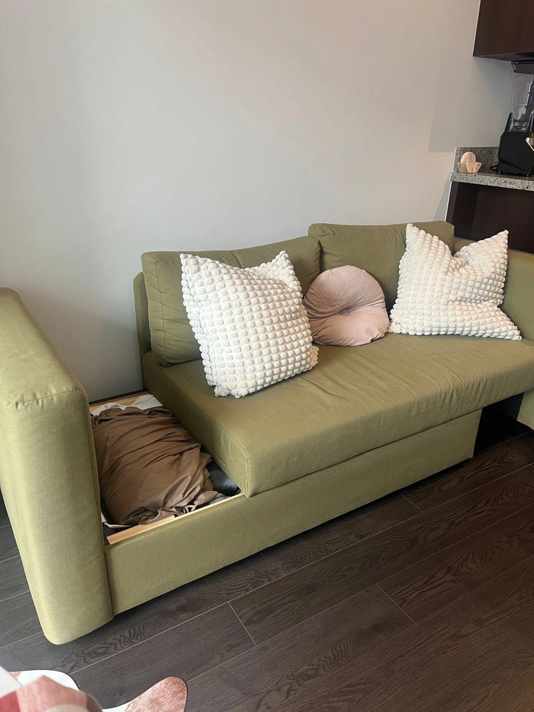 Beautiful sofabed (pillows included), less than a year of use. Disassemblable sofabed with storage space underneath. Check my other items. Pick up Olympic Village.