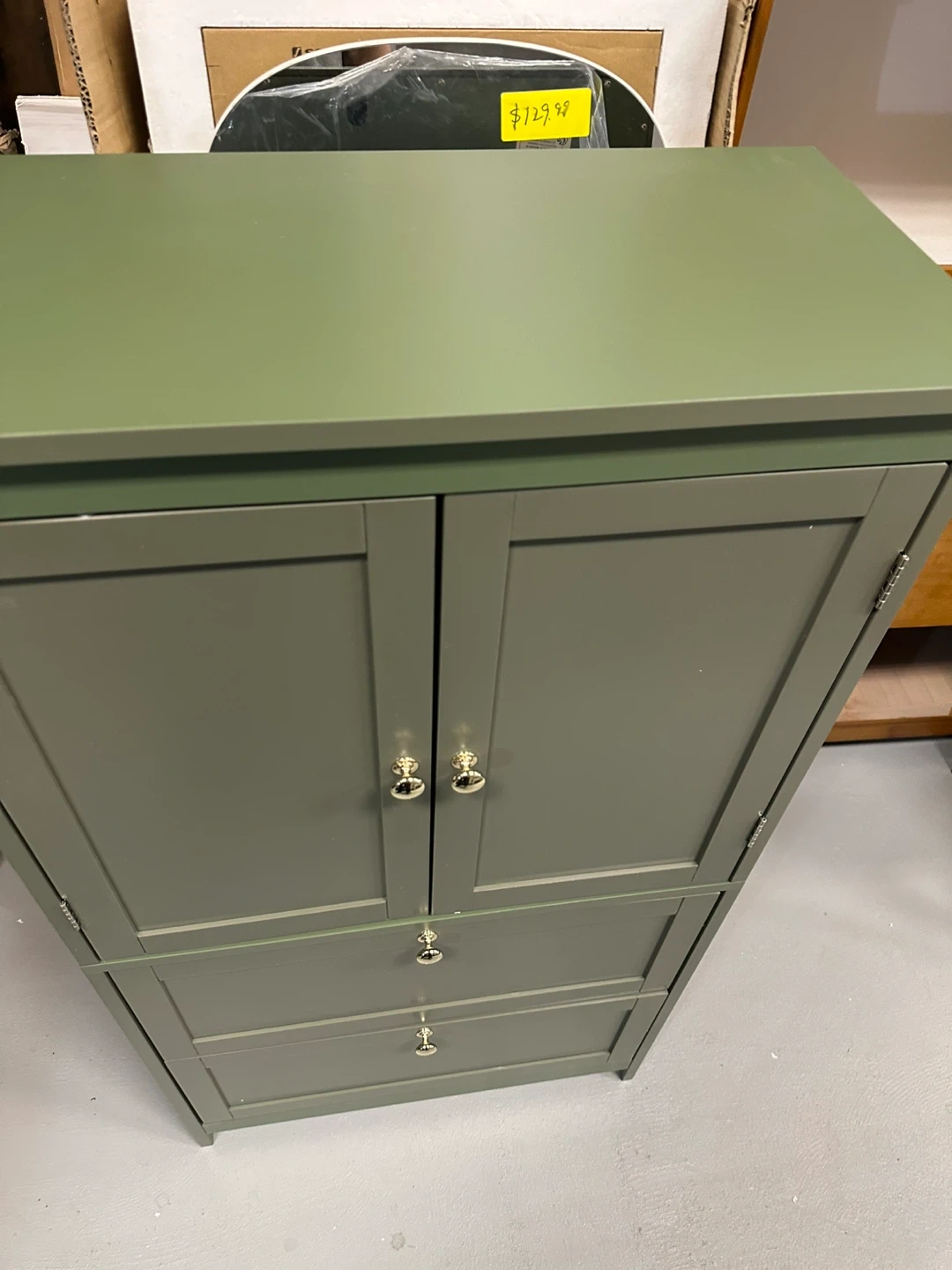 This is a lovely green storage cabinet with both doors and drawers, perfect for adding some extra storage space to any room in your home. It features a cabinet with shelves and a drawer, offering versatile storage options. It's in great condition and ready for a new home!