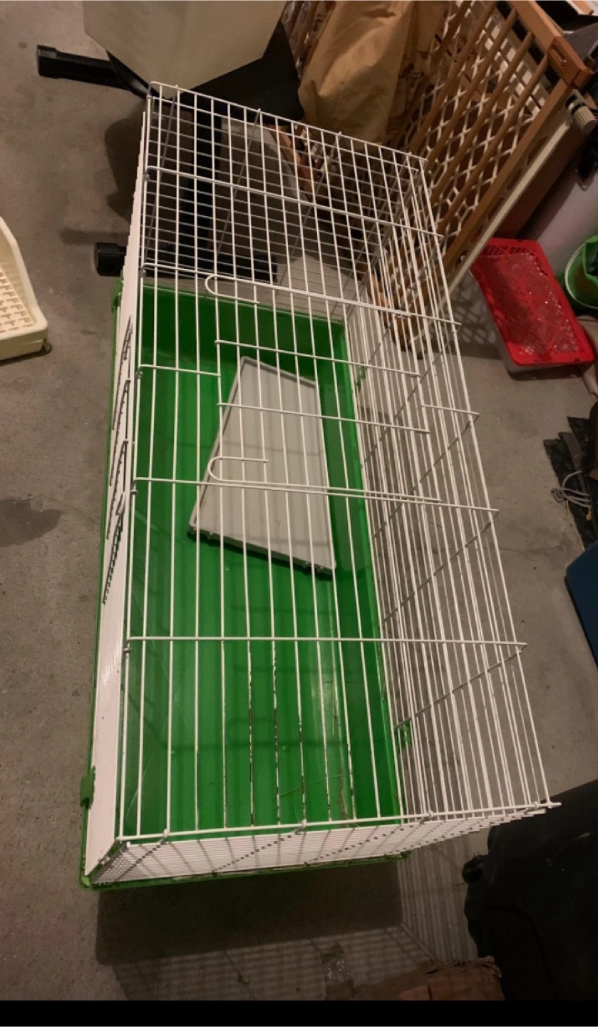 Selling a large size pet cage with a green base and white wire top. It's in good condition and ready for a new furry friend!
