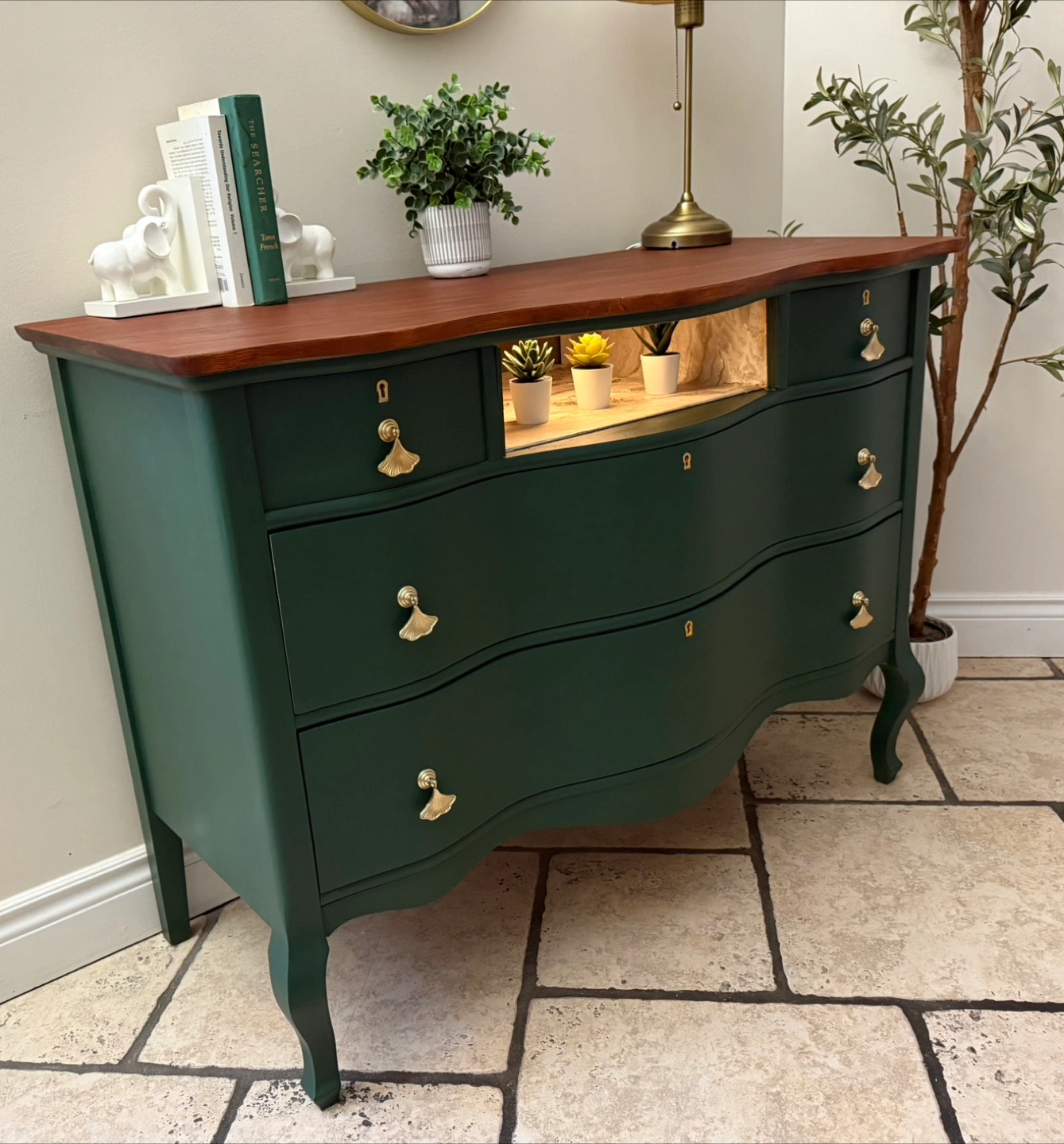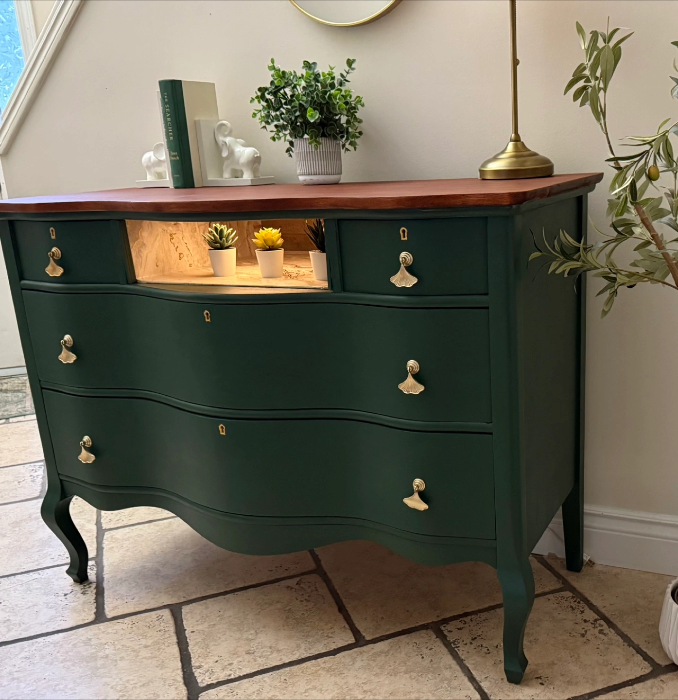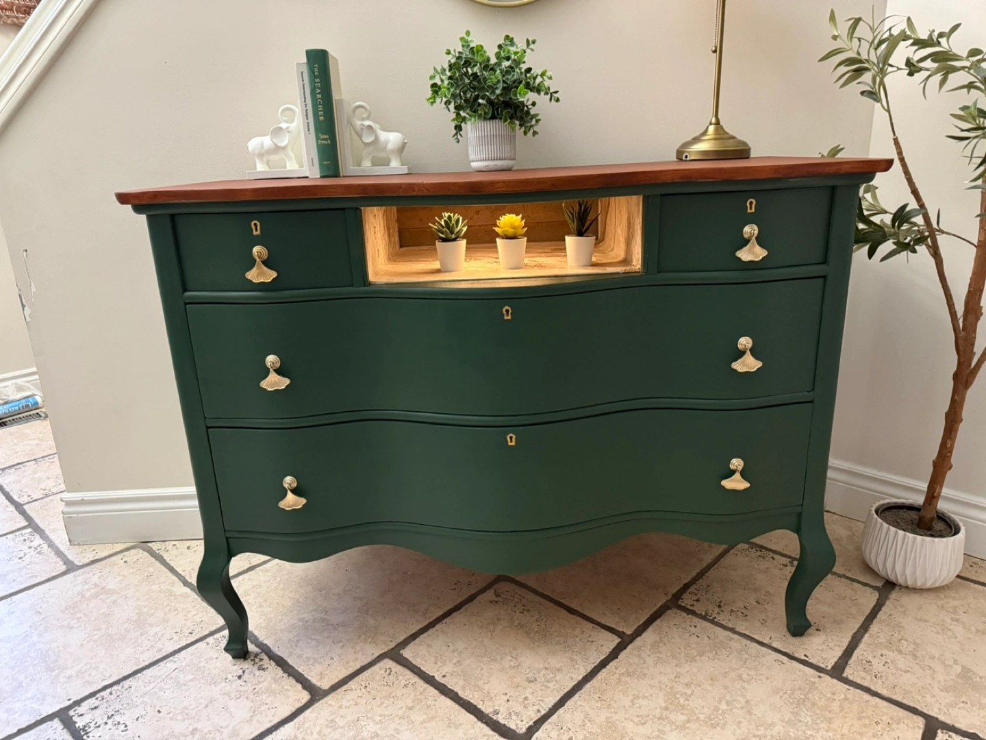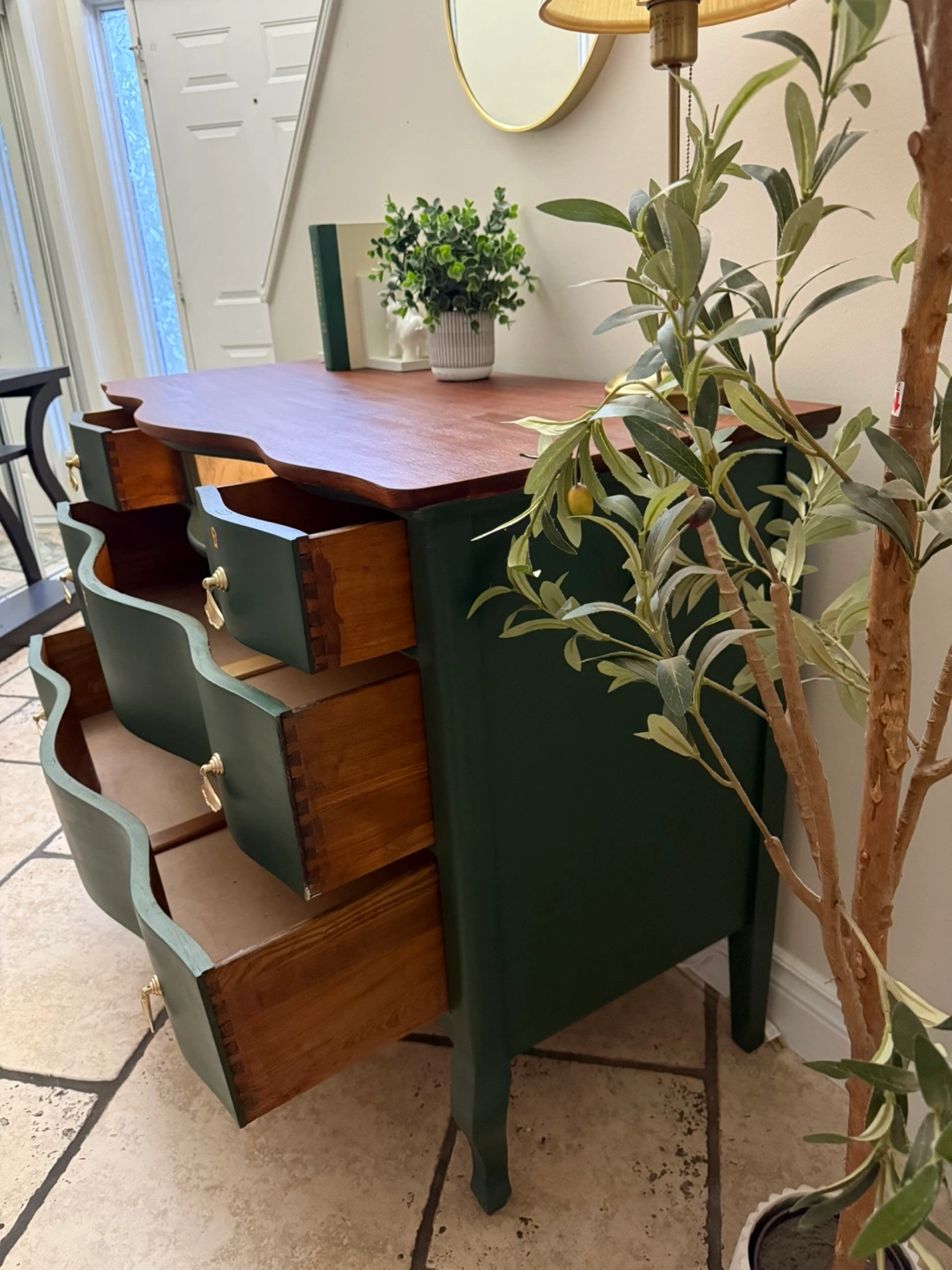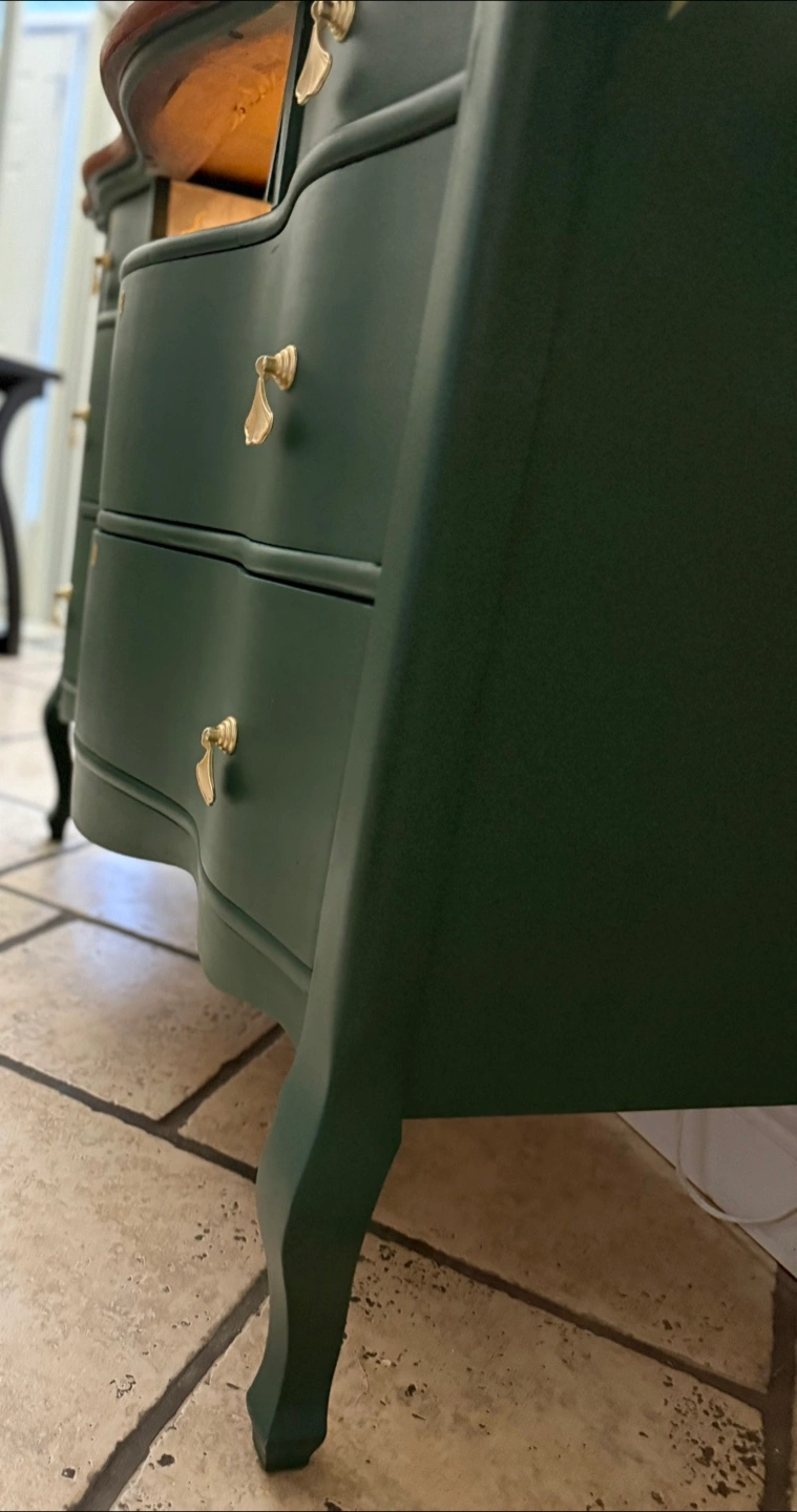 Here's a beautiful green dresser with a wooden top and elegant gold accents! It features multiple drawers for ample storage space. This piece would add a touch of sophistication to any room in your home