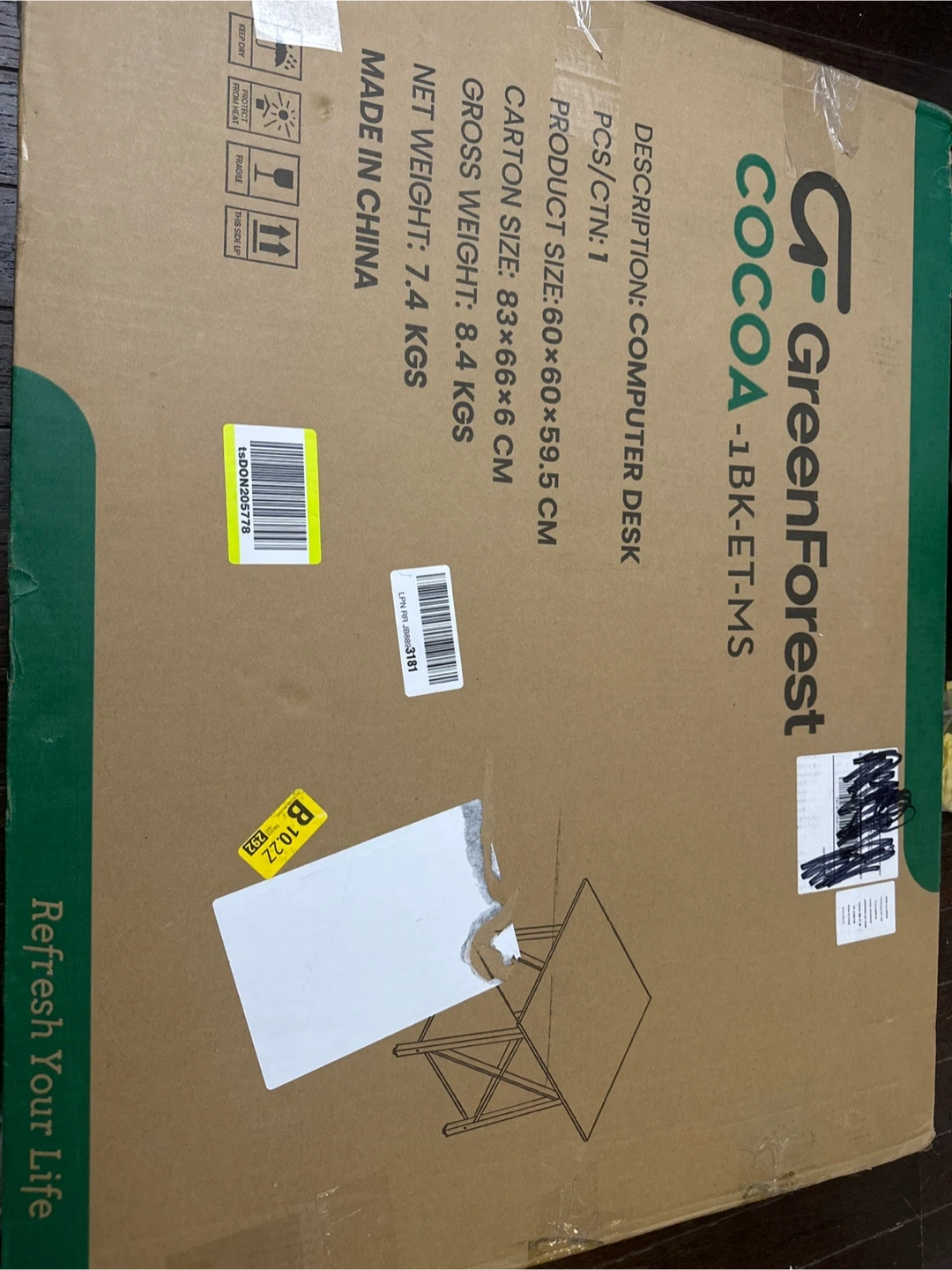 Selling a GreenForest Cocoa computer desk! The product size is 60x60x59.5 cm. The carton size is 83x66x6 cm, with a gross weight of 8.4 kgs and a net weight of 7.4 kgs. It's a great desk for any home office setup