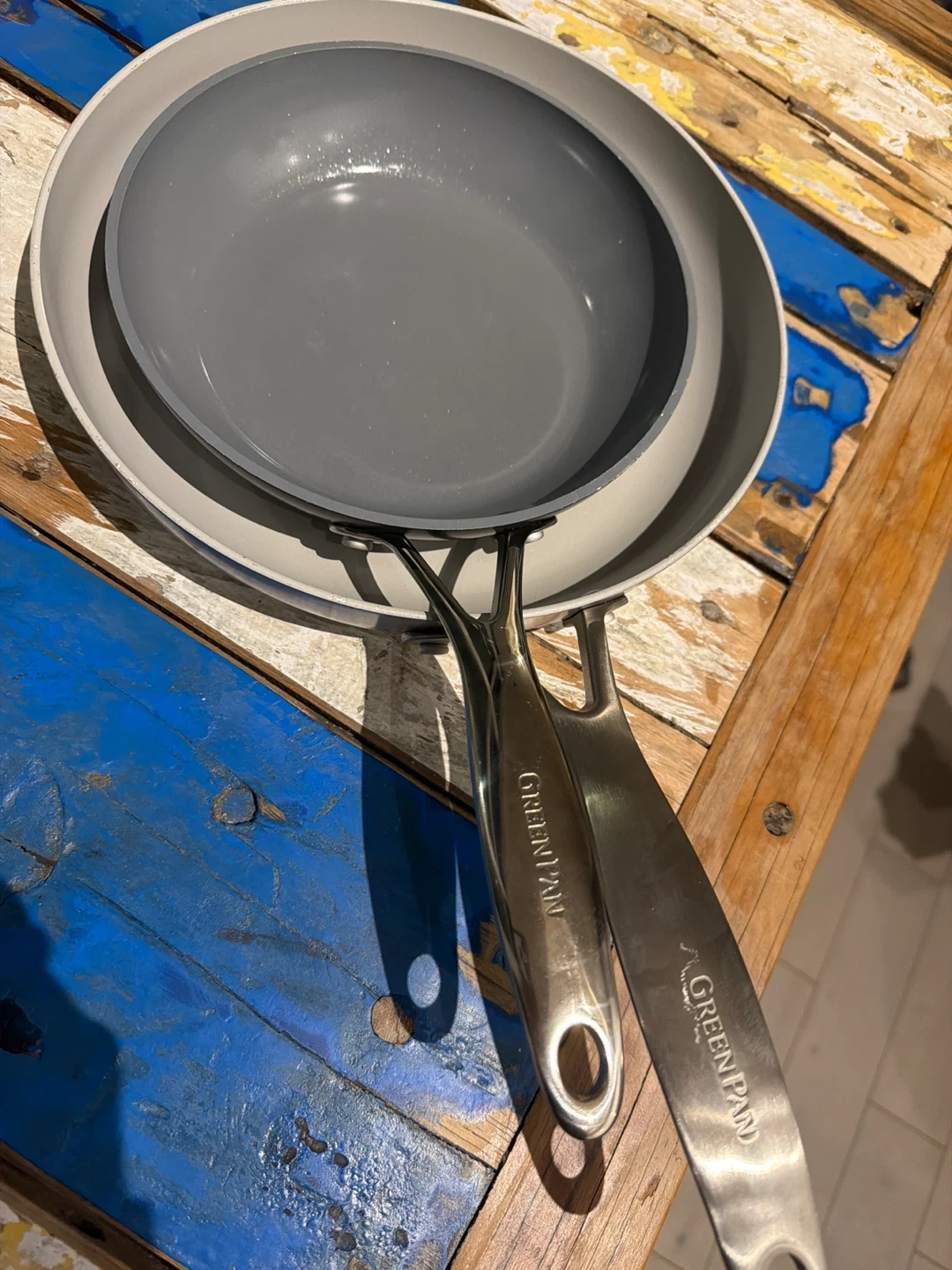 410Selling a set of GreenPan frying pans. They're in good condition and ready for a new home! There are some signs of use on the big pan.