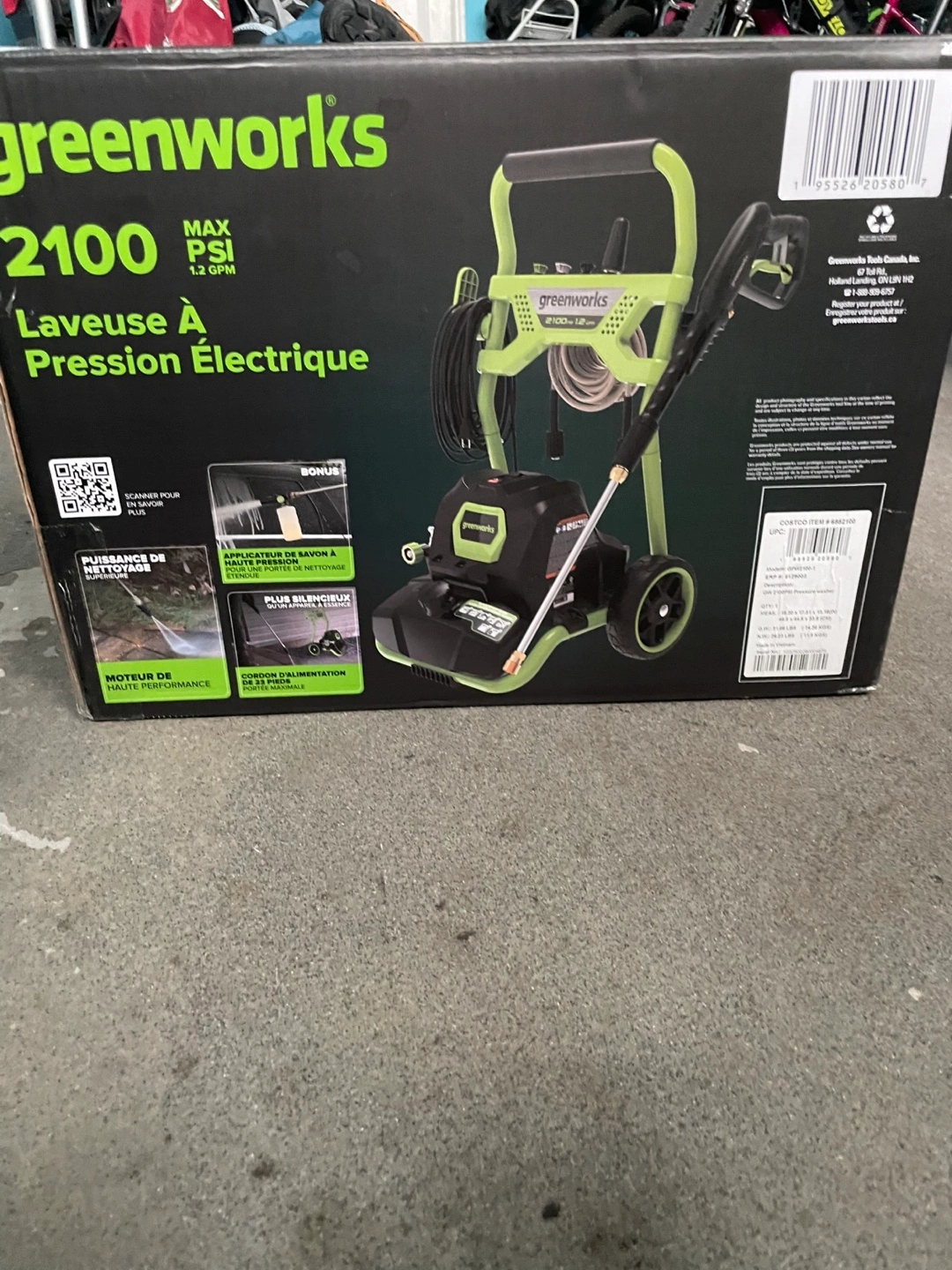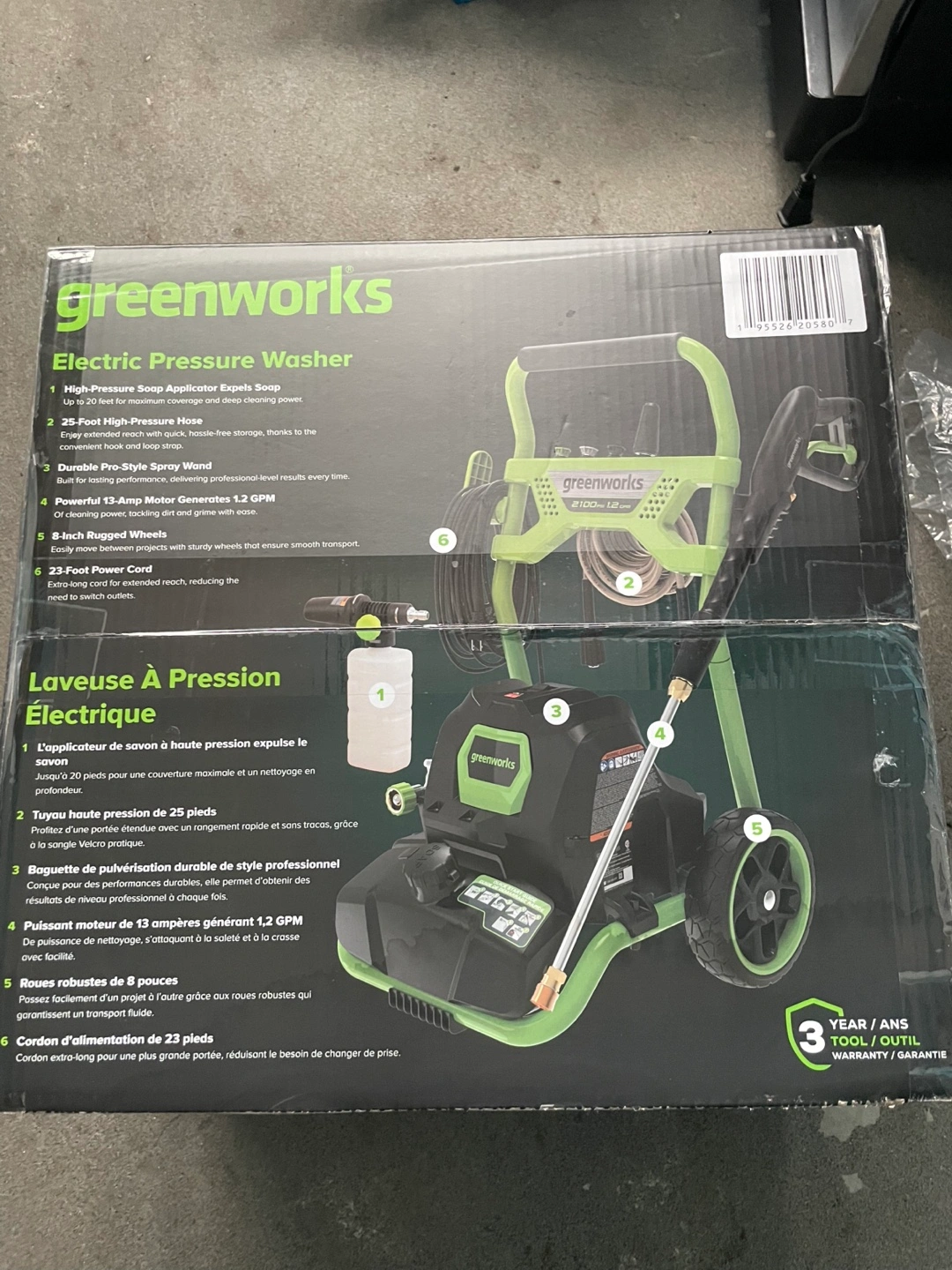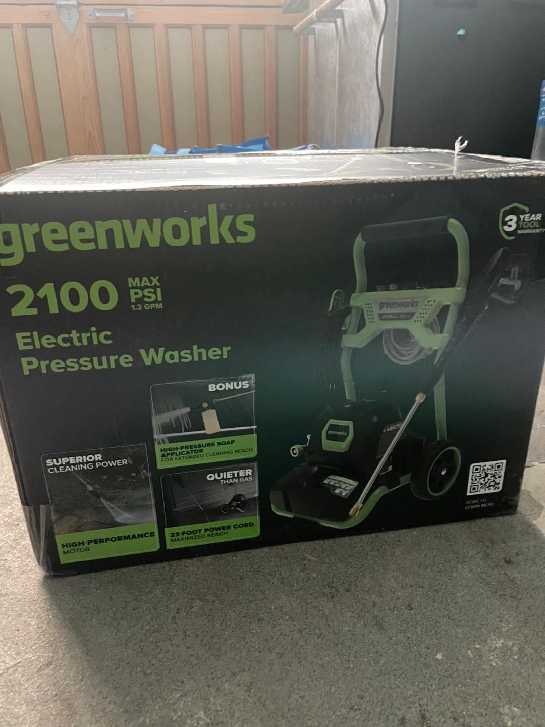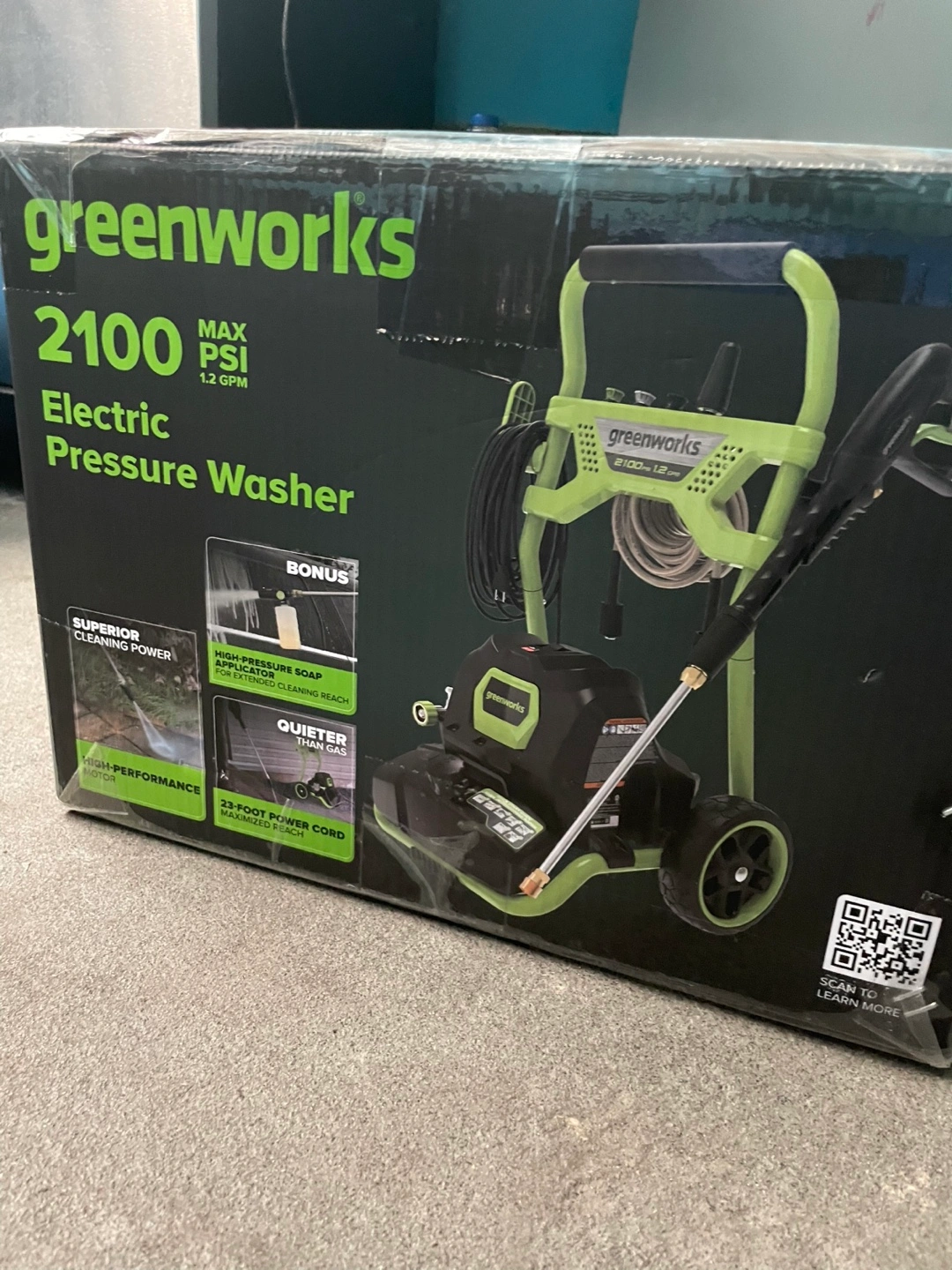 16Selling a brand new Greenworks 2100 PSI electric pressure washer! It's still in the box and ready to go. Selling this because got it as a gift It features: - High-pressure soap applicator - 25-foot high-pressure hose - Durable pro-style spray wand - Powerful 13-amp motor generating 1.2 GPM - 8-inch rugged wheels - 23-foot power cord Has 3 year warranty Need gone asap