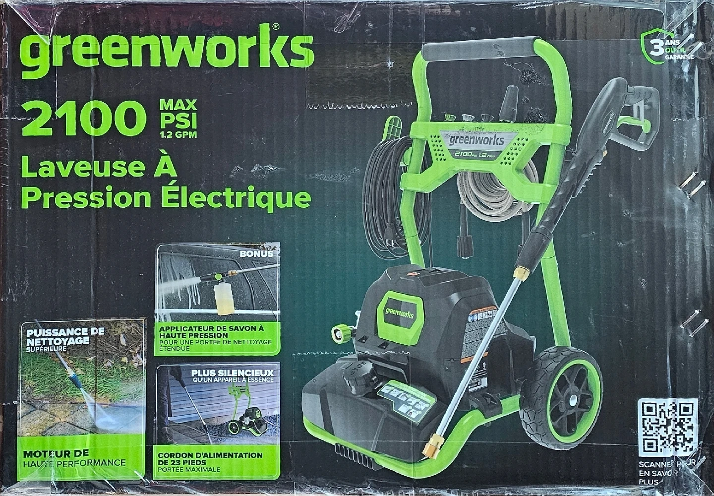 71Selling a Greenworks 2100 MAX PSI electric pressure washer! It comes with a high-pressure soap applicator for convenient soap and detergent application. The 25-foot high-pressure hose reaches up to 20 feet for maximum coverage and deep cleaning power. It also has a durable pro-style spray wand and a powerful 13-amp motor that generates 1.2 GPM. Easy with 8-inch rugged wheels that ensure smooth transport!
