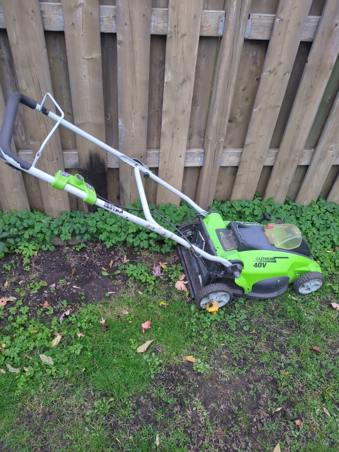 657Giving away a Greenworks 40V lithium lawn mower. It's in ok condition and ready to keep your lawn looking great! NO BATTERY, only comes with charger. Meet at 1111 Broadview avenue for pickup.