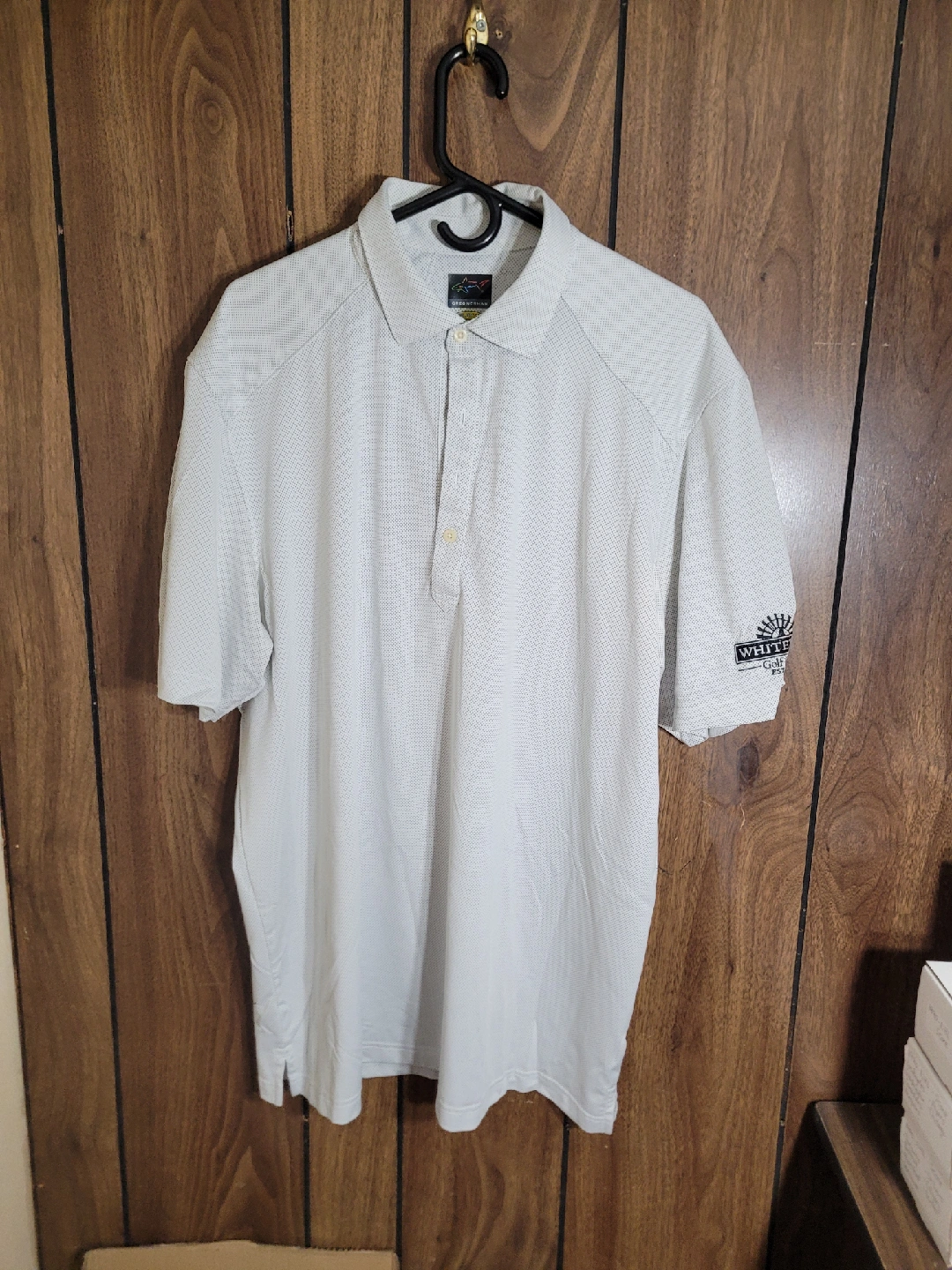 197Selling a Greg Norman Play Dry polo shirt in size XL. It's in great condition and features a subtle dotted pattern. Perfect for golf or casual wear!