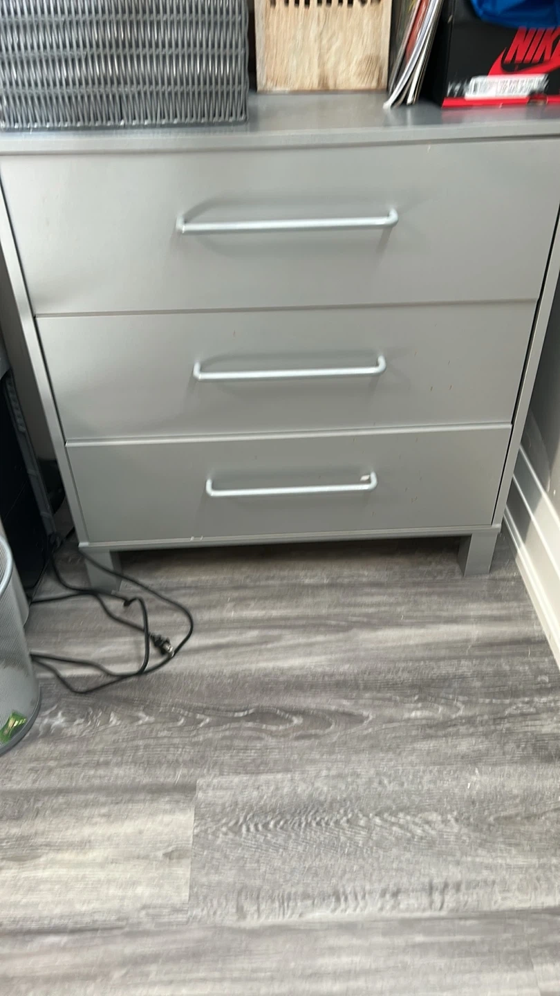 Selling a grey 3-drawer dresser! It's in great condition and ready for a new home. Perfect for organizing your clothes or other belongings. Has a sleek and simple design that fits well with any decor
