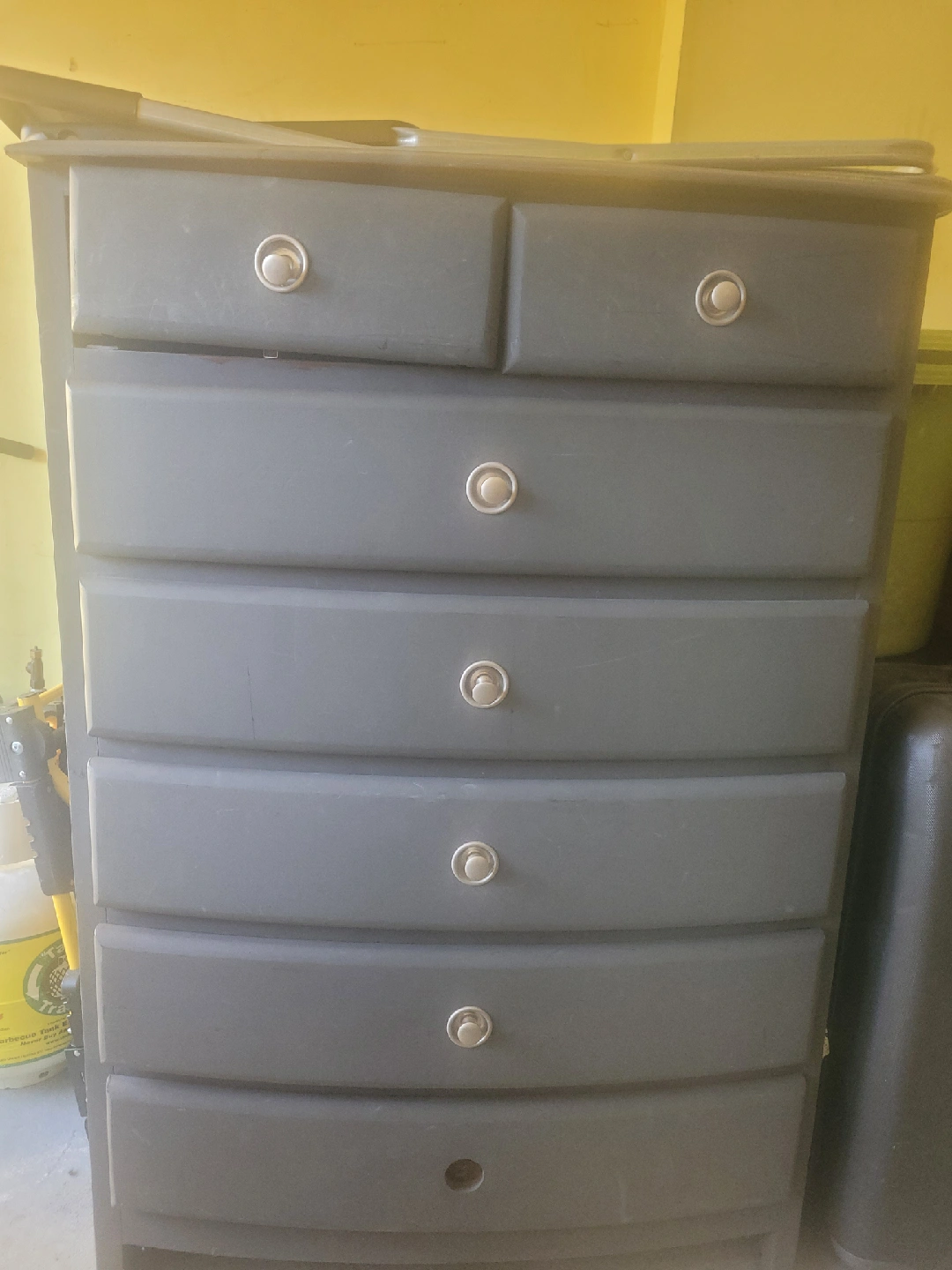 60Here's a sturdy grey dresser with 7 drawers. It's perfect for storing clothes or anything else you need to keep organized. The drawers are spacious and in good condition. It's a great piece for bedroom or storage area! one drawer is missing a know.