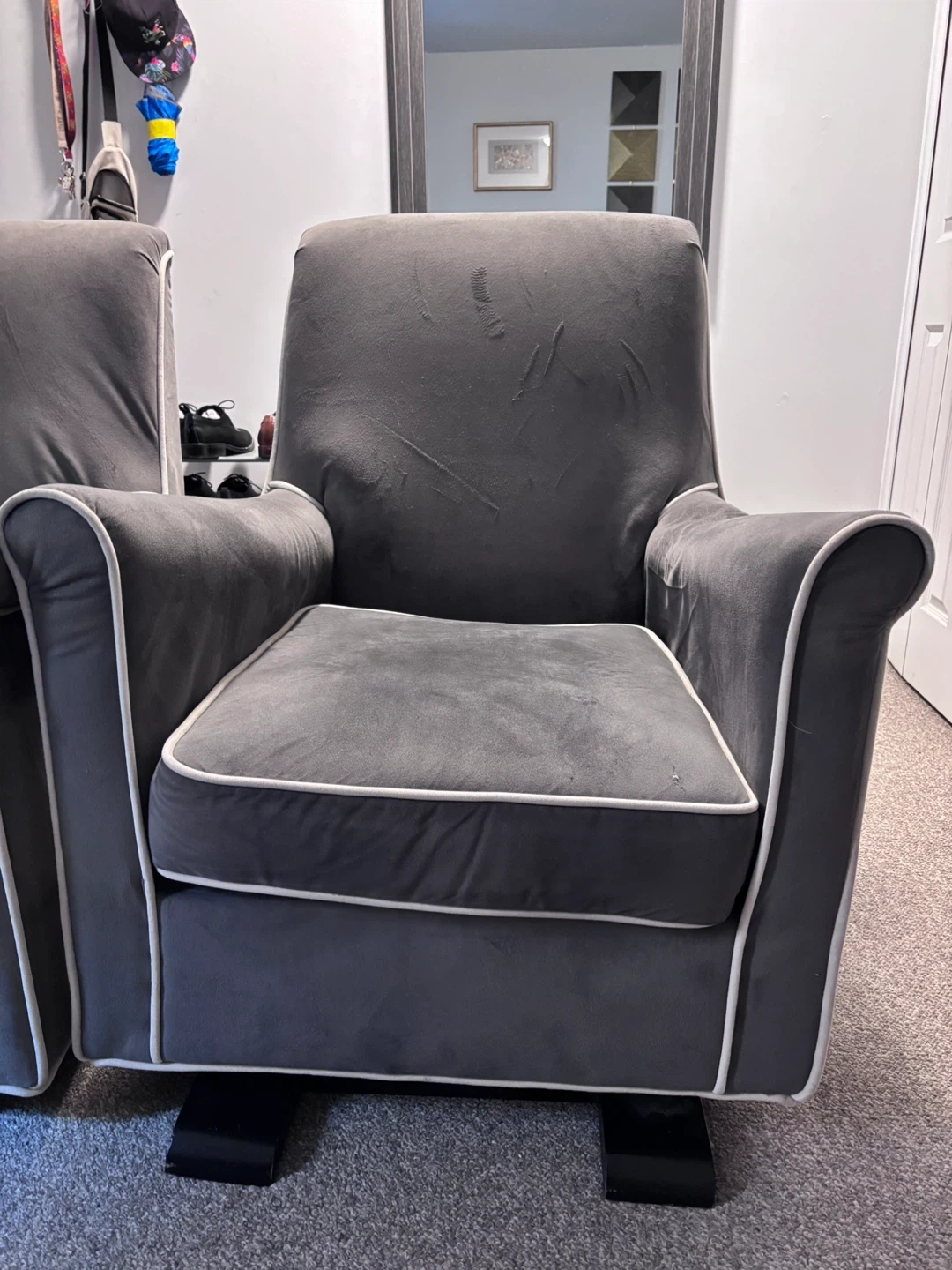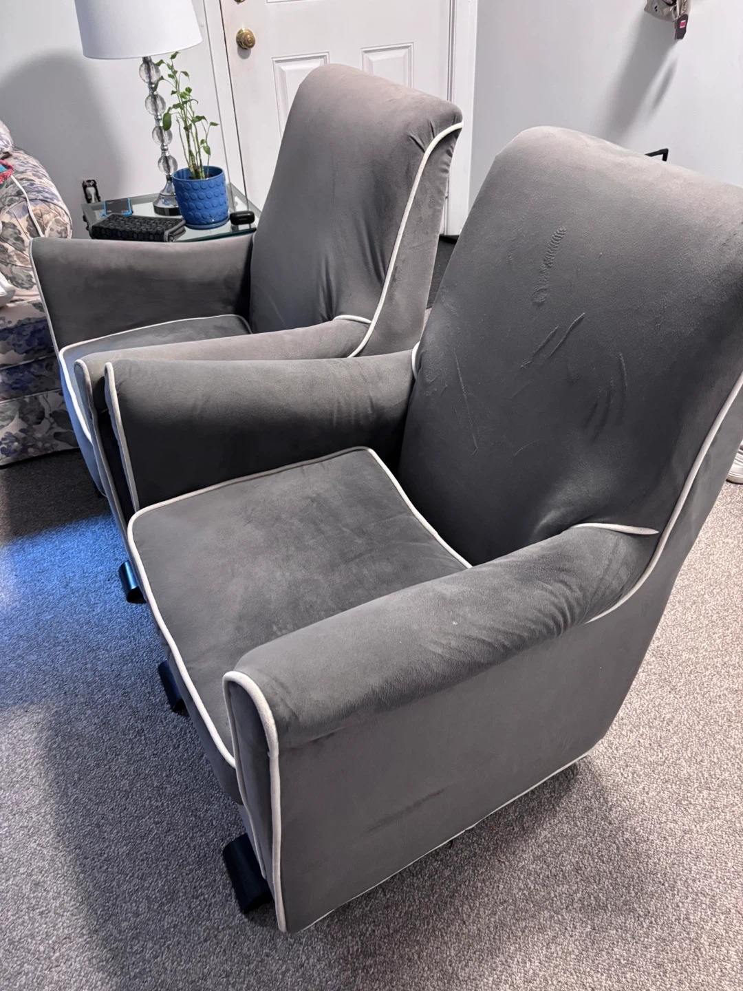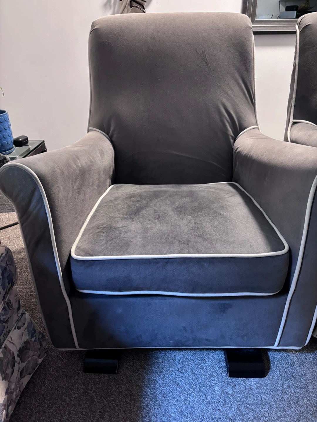 Selling a set of two grey accent rocking chairs. They're in good condition and would look great in any living room or bedroom. The chairs feature a sleek design with white piping.