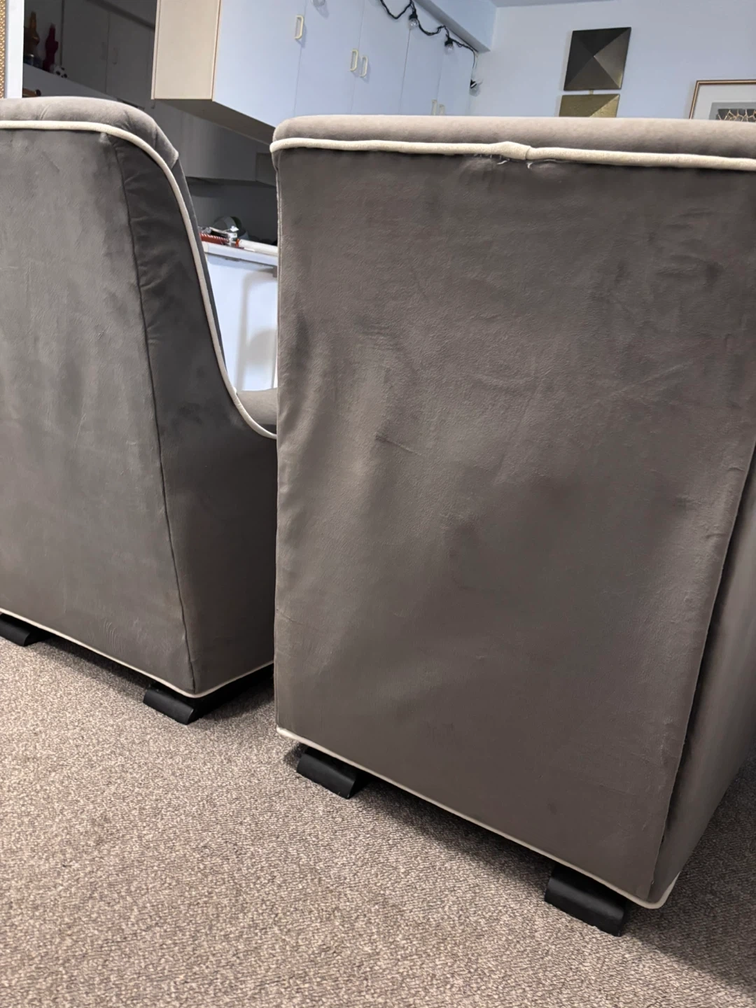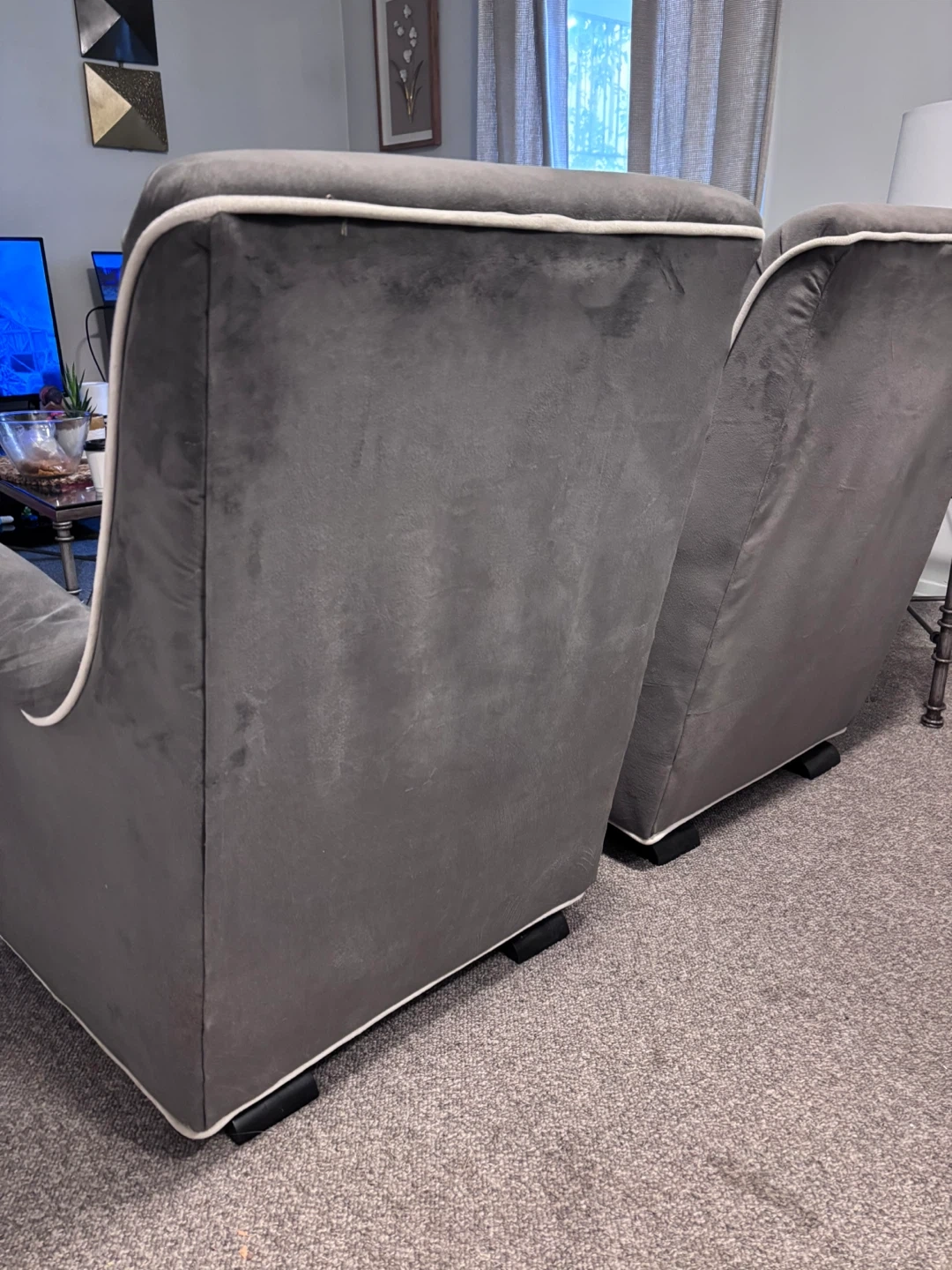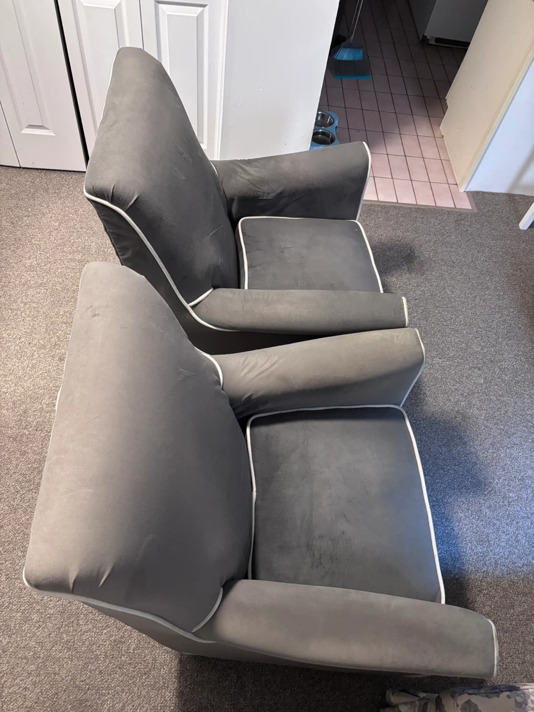Selling a set of two grey accent rocking chairs. They're in good condition and would look great in any living room or bedroom. The chairs feature a sleek design with white piping.
