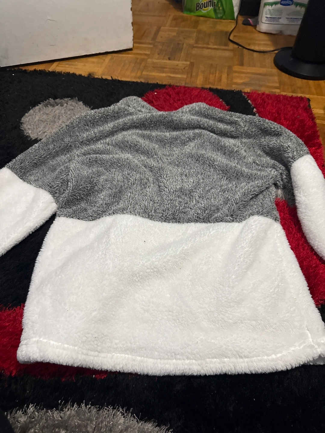 Soft and cozy fleece pullover. Grey and white colour block design. Half zip closure. Long sleeves. Great for lounging or casual wear.