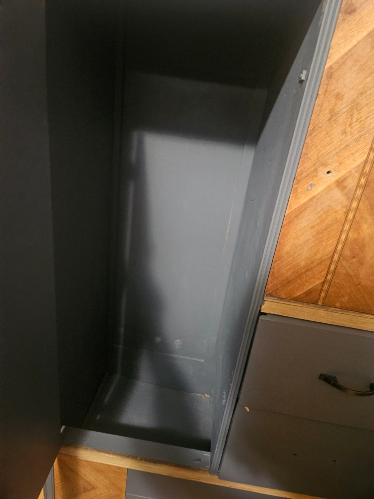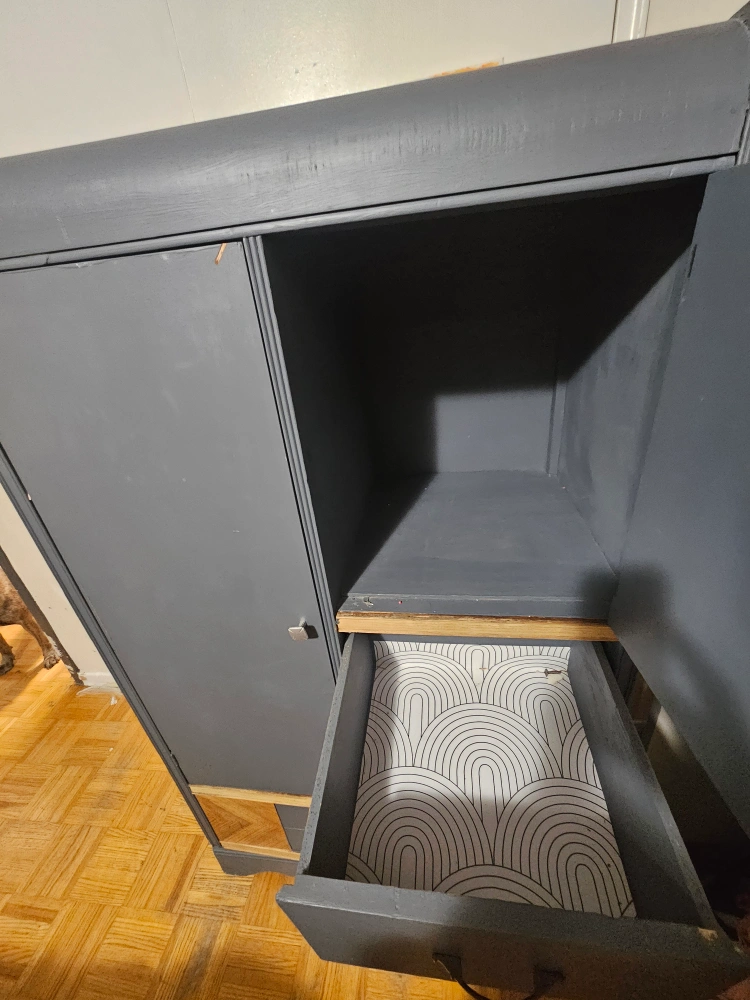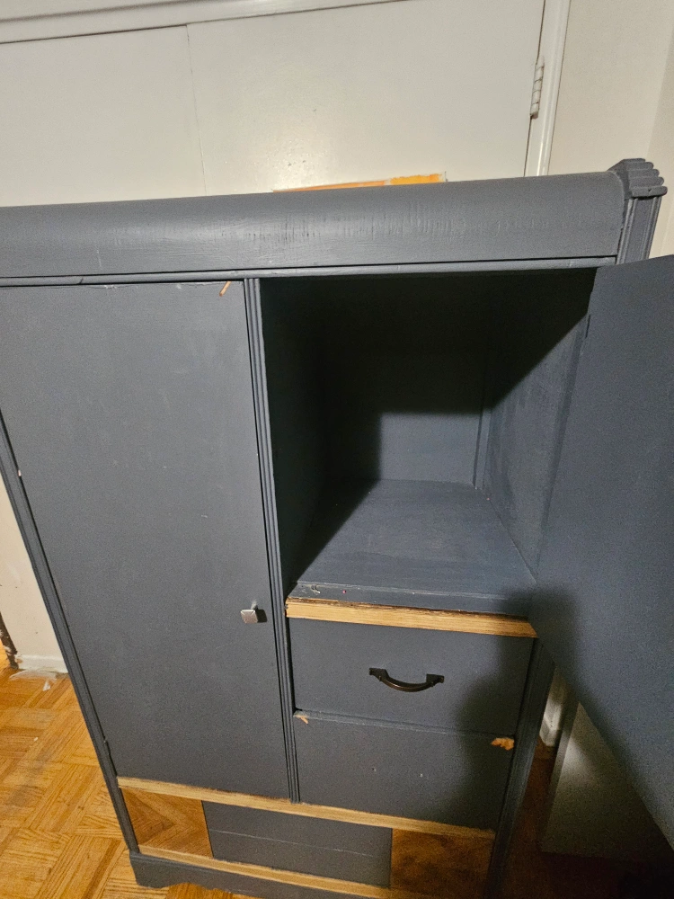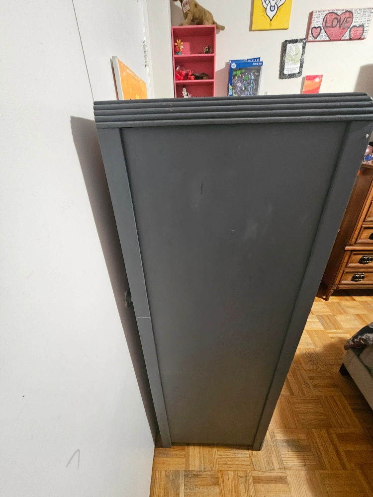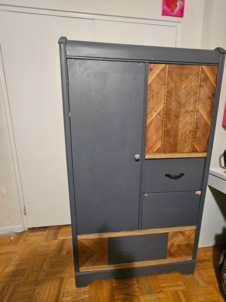 73Selling a grey armoire wardrobe. It has a door on one side with a metal hook to hang clothes and two drawers on the other side. There's also some decorative wood detailing. It has some signs of wear.