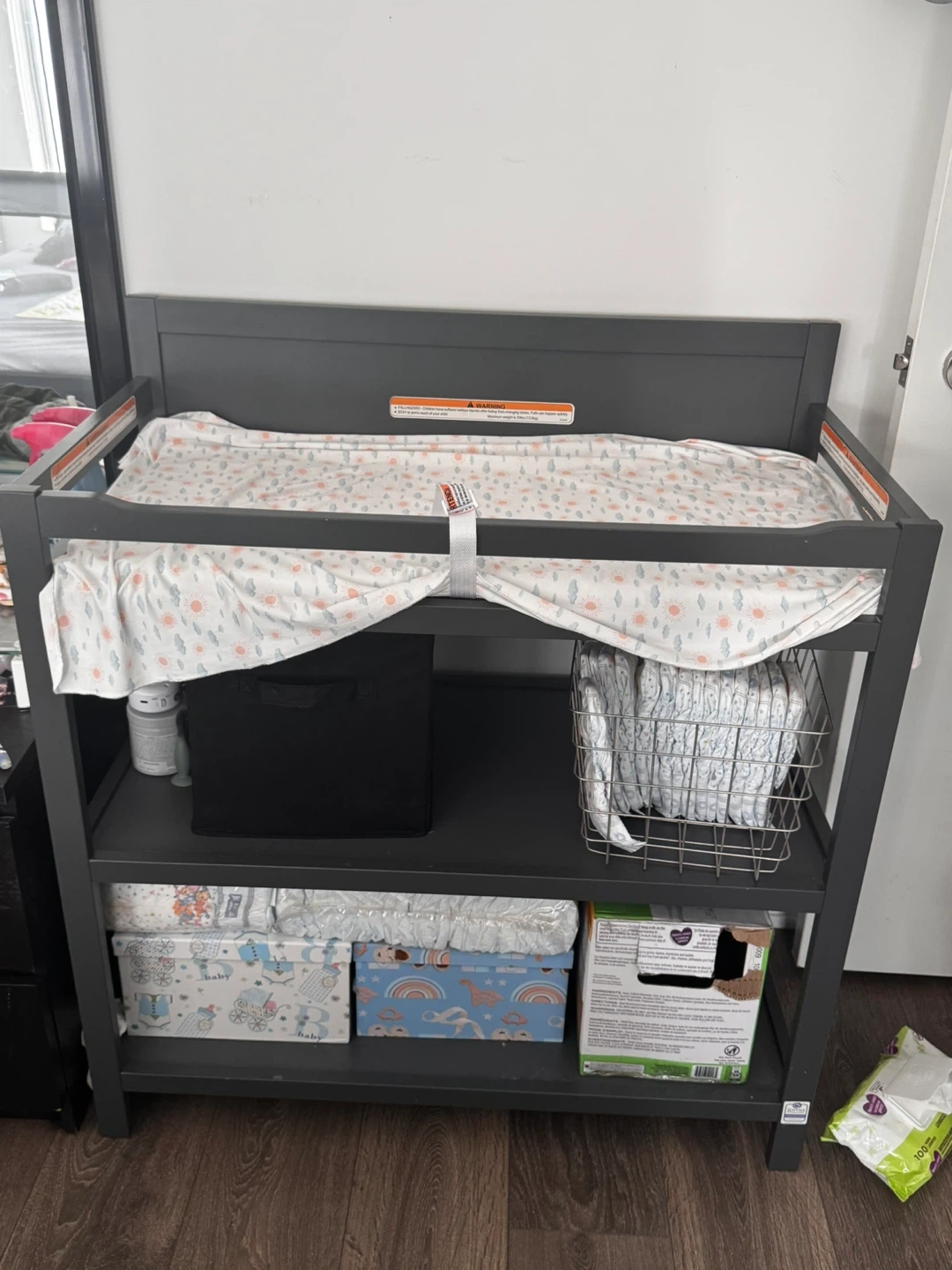 Selling a handy grey baby changing table. It has shelves underneath for storing diapers, wipes, and other baby essentials. It's in good condition and ready for a new home!