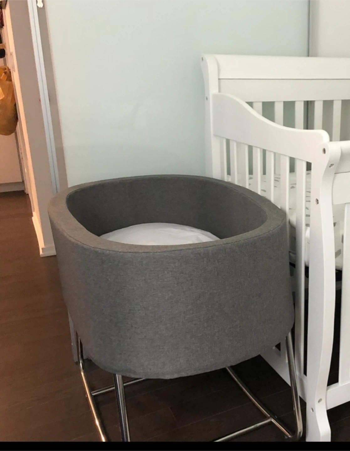 137Selling a gently used bassinet. It features a comfortable, padded interior, perfect for your little one. The bassinet is a stylish grey colour and sits on a sturdy metal stand. It's a great addition to any nursery!