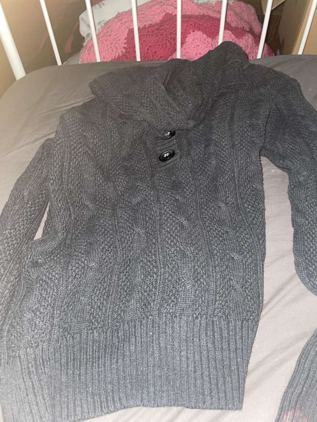 Cozy grey knit sweater with a button-up collar design! It's in great condition and perfect for layering during the cooler months