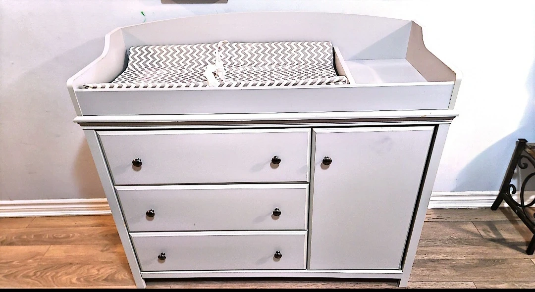 I'm selling a solid wood changing table that has three drawers and a side cabinet for extra storage! It comes with a changing pad (optional). The changing table is in good condition and is a light grey colour. It's disassembled for easy transport.