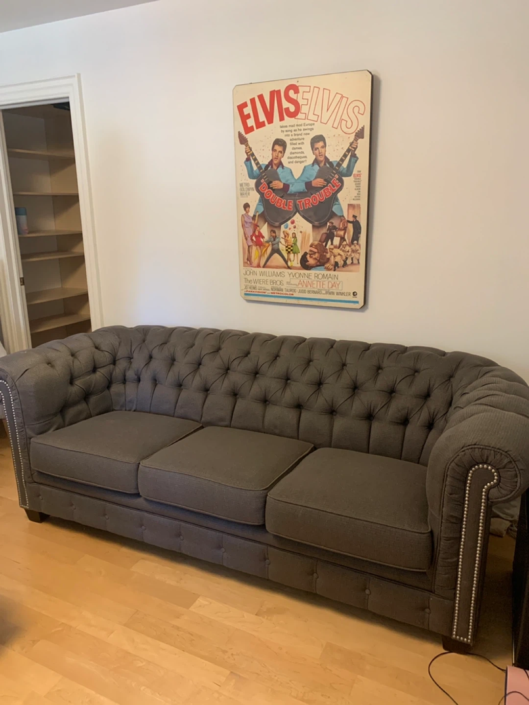 78Selling a comfortable grey chesterfield style sofa. It's in good condition and would be a great addition to any living room. It has a classic look and feel, perfect for relaxing or entertaining guests