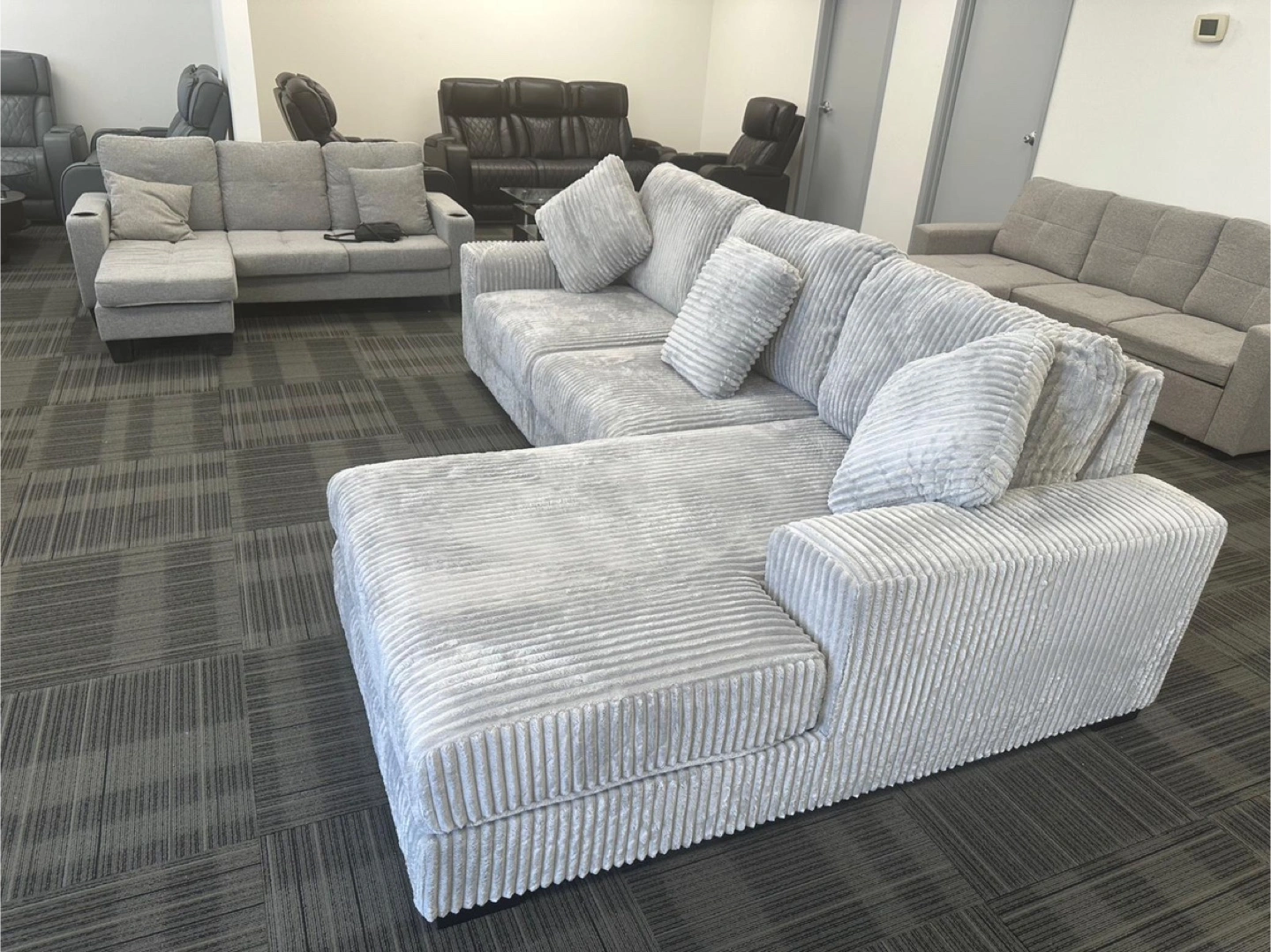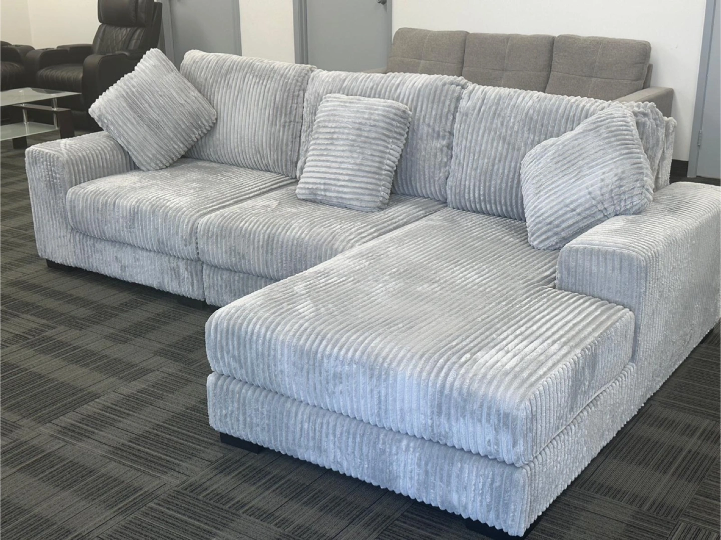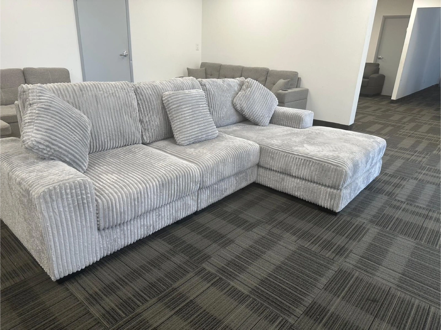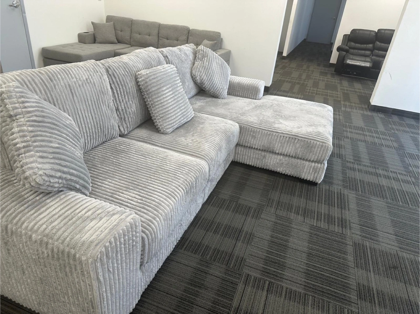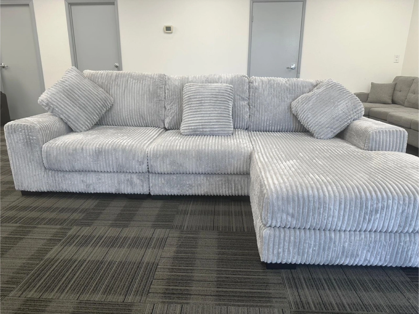 A comfy grey corduroy sectional sofa. It's in great shape and would be a perfect addition to any living room or den. The material is soft and inviting, making it a great spot to relax after a long day. Comes with the cushions pictured!