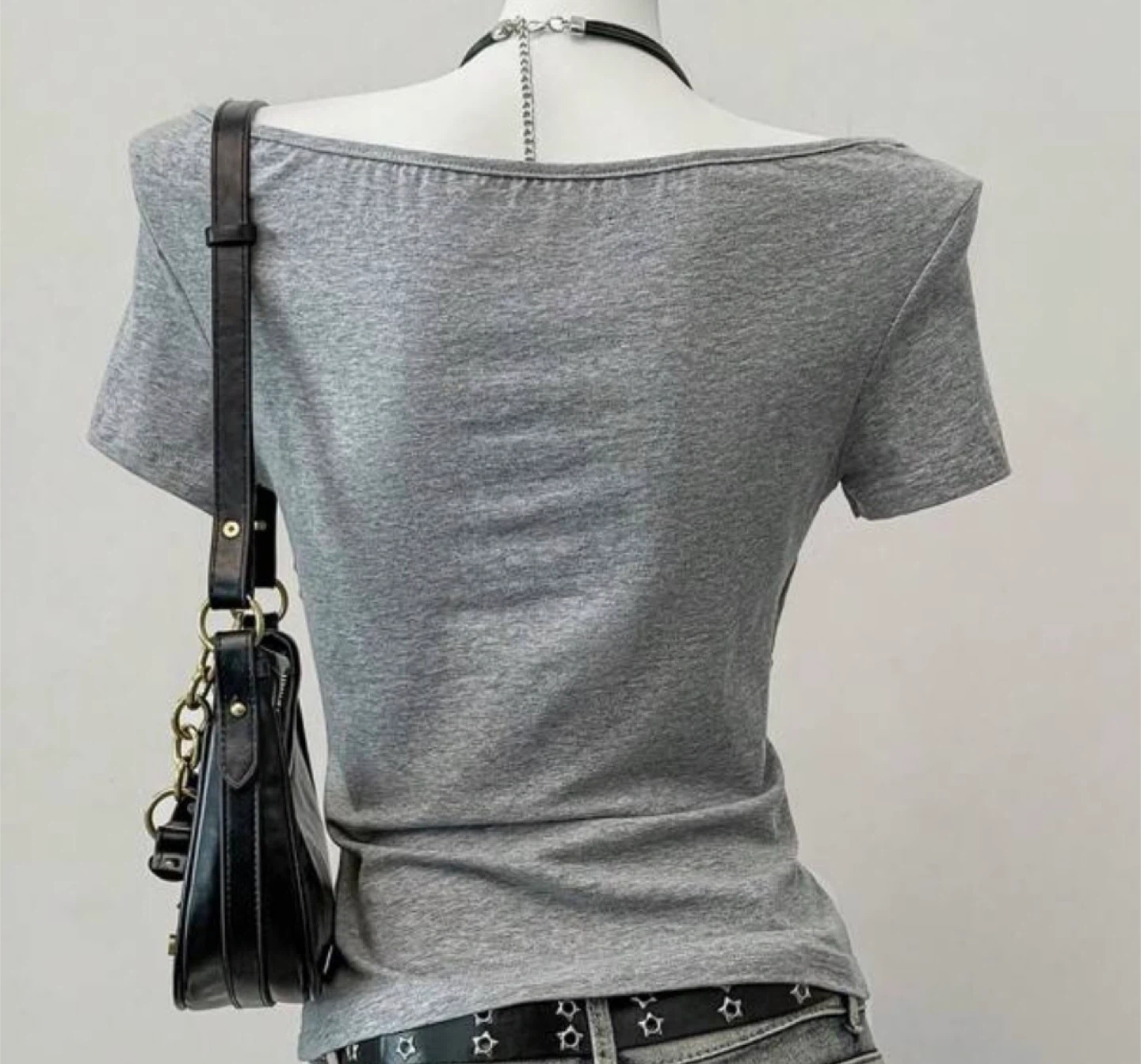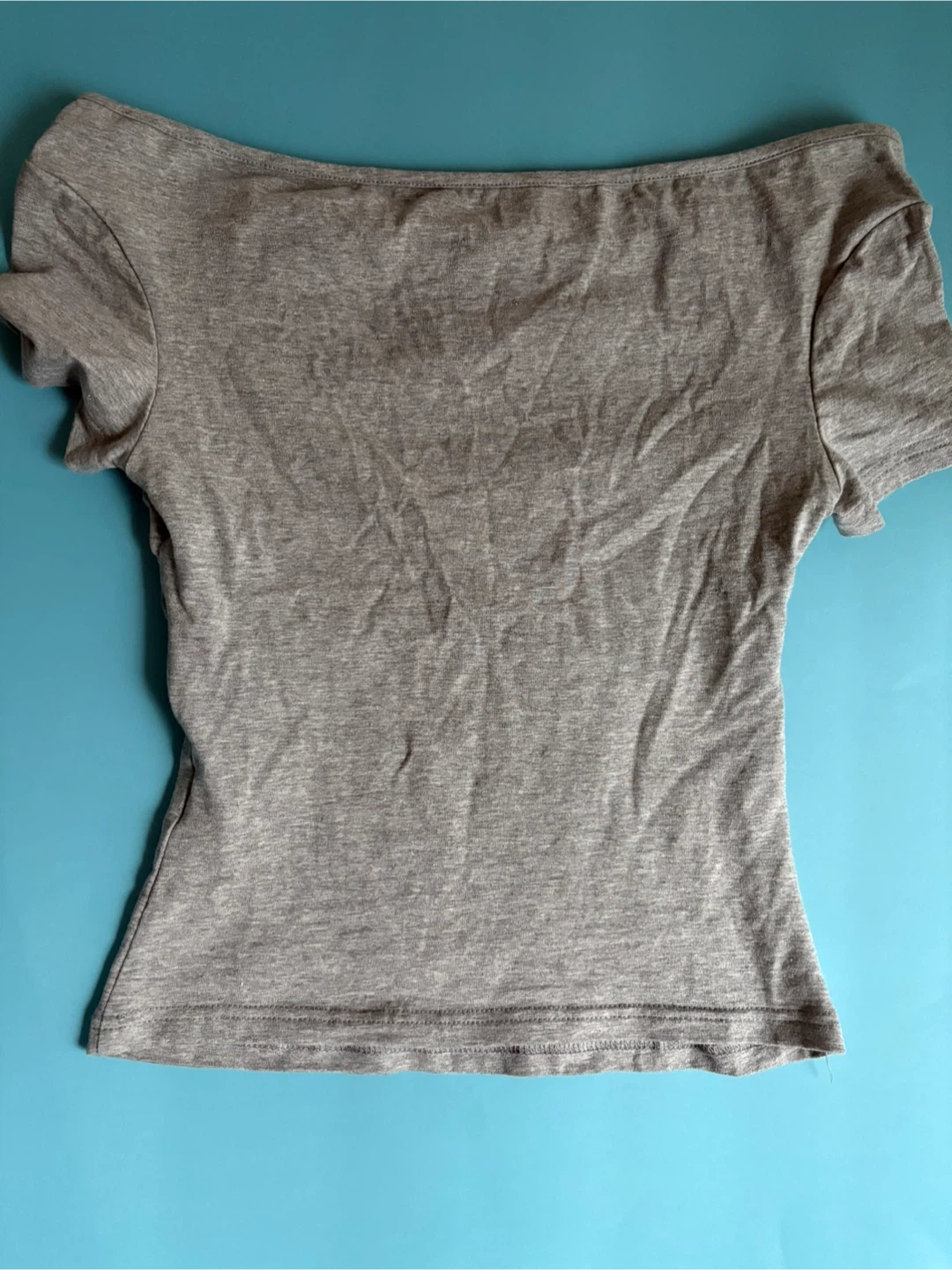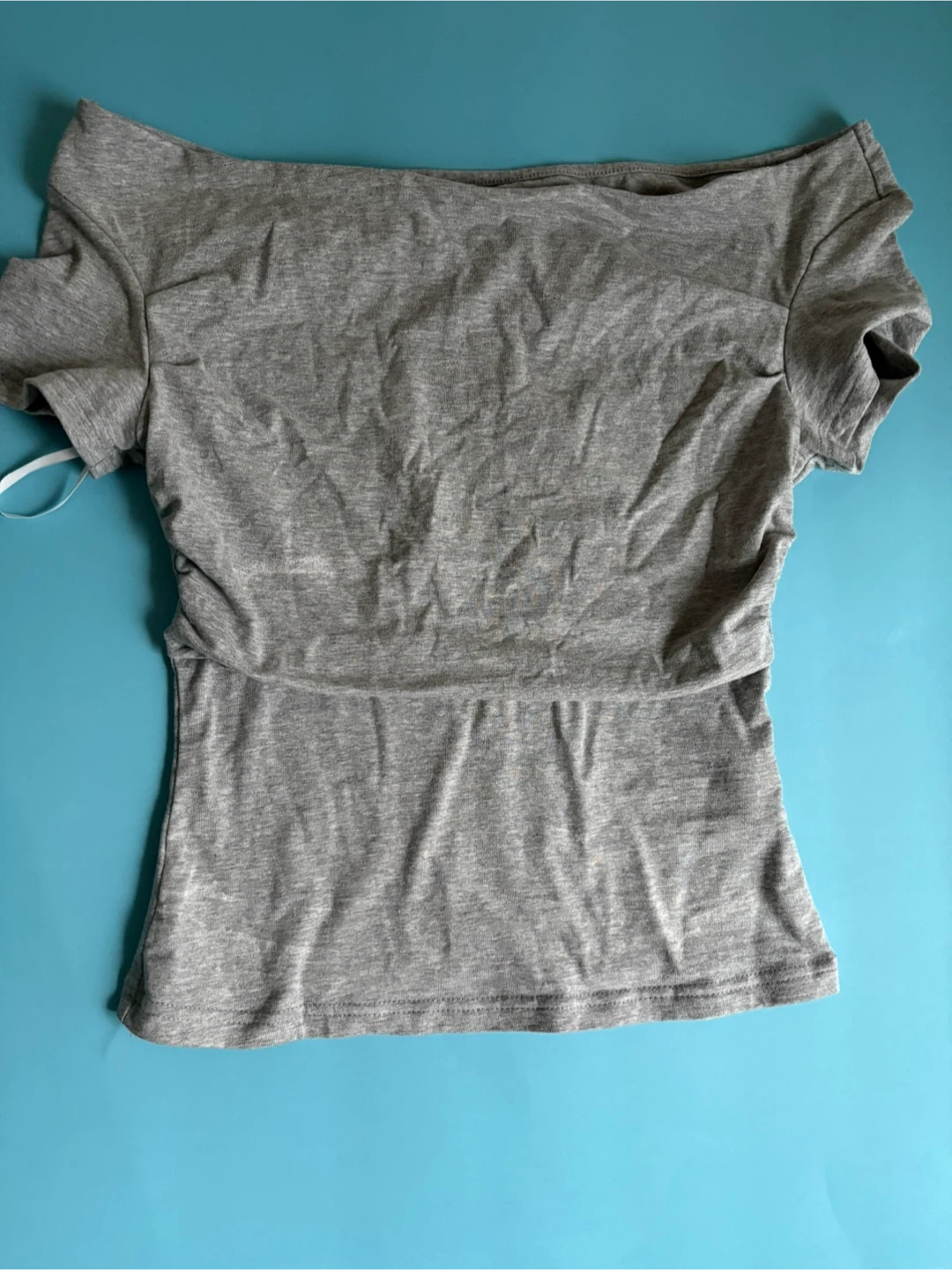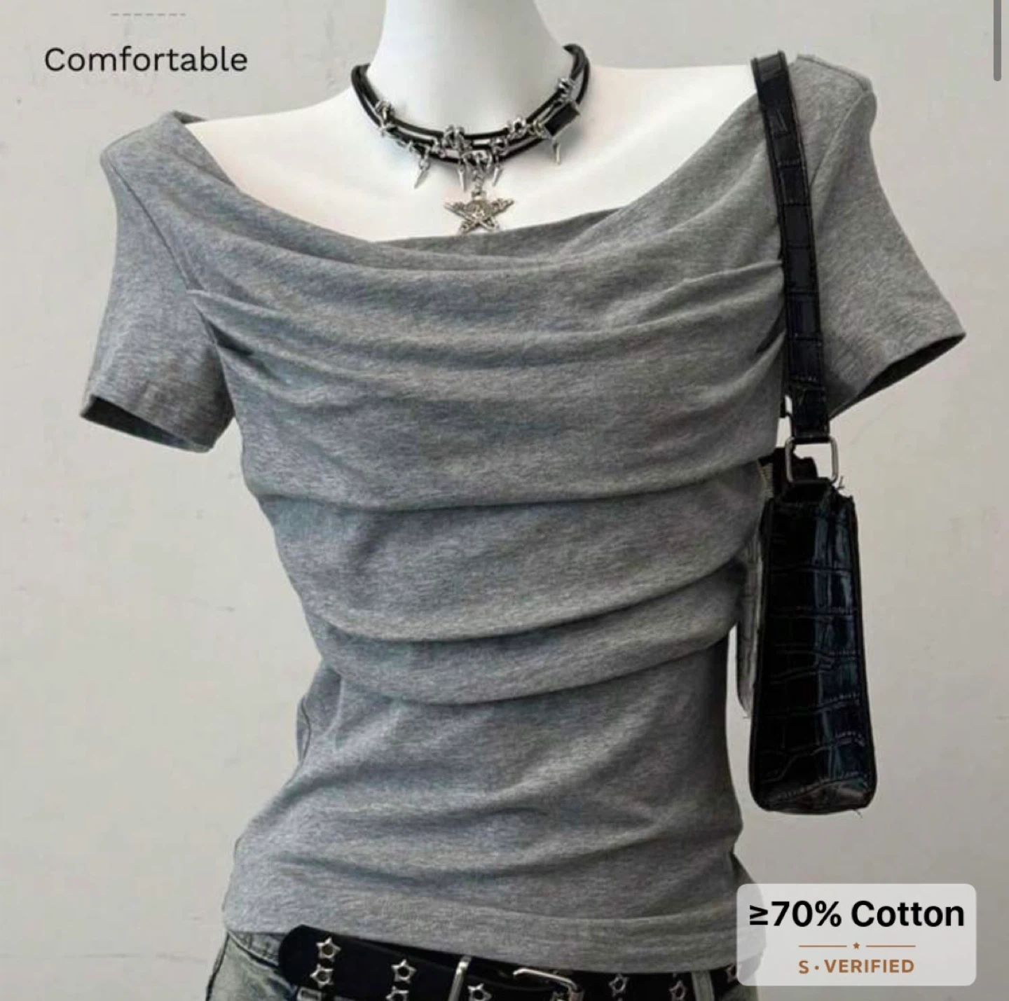 Here's a cute grey top made with at least 70% cotton! It's a comfortable and stylish piece that's easy to pair with jeans or a skirt for a casual look