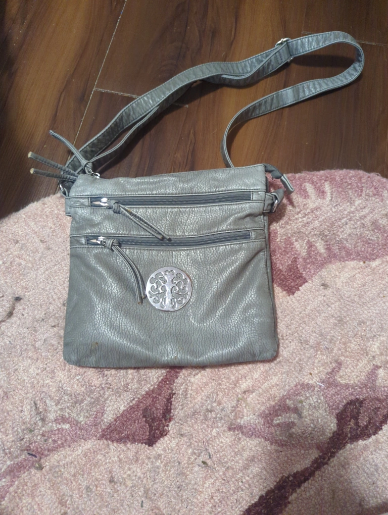 52Selling a grey crossbody bag. It's in great condition and has multiple zippered compartments. Perfect for carrying your essentials!