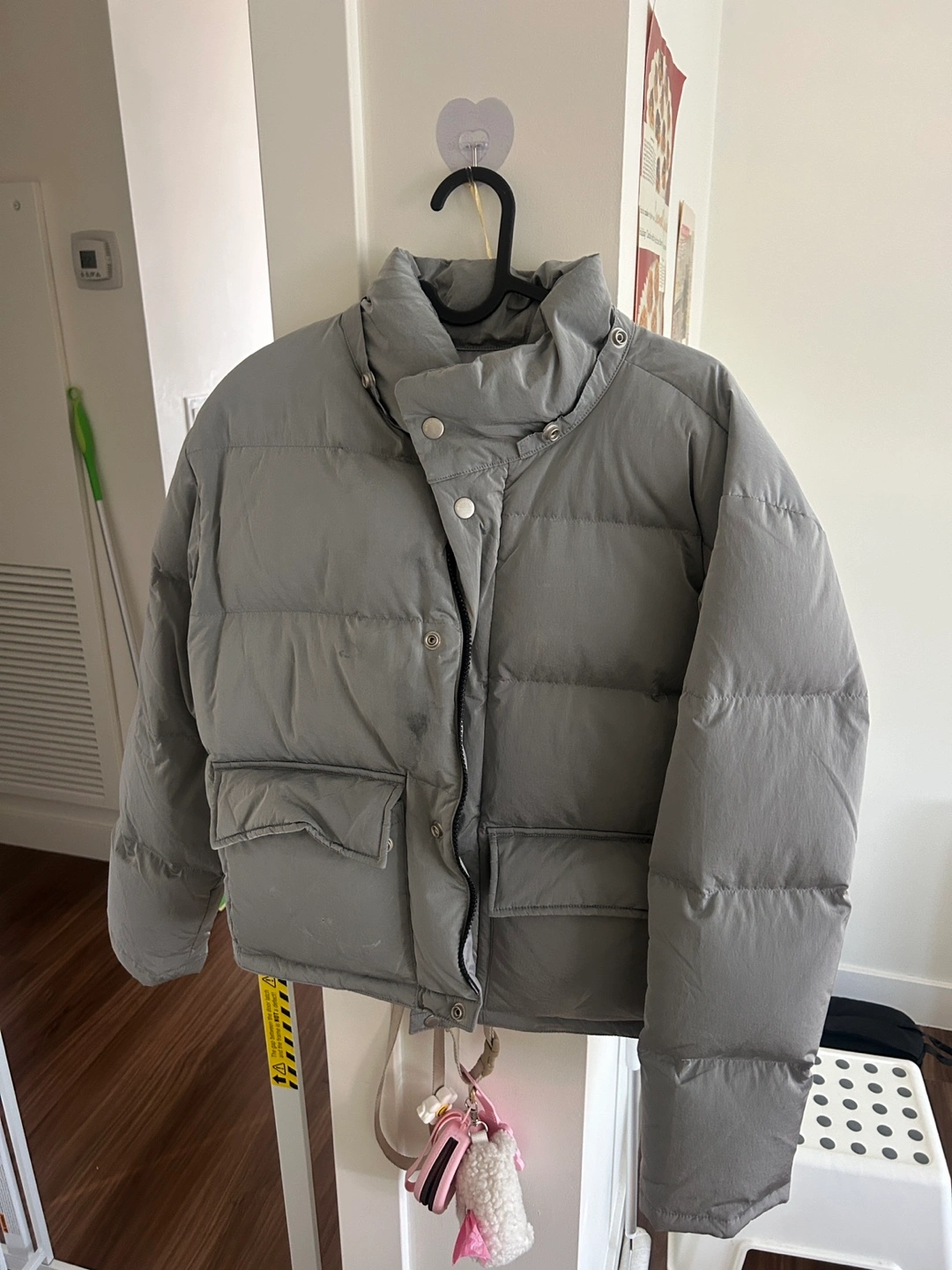 Grey cropped puffer jacket. Features a high collar and multiple pockets. Zipper closure.