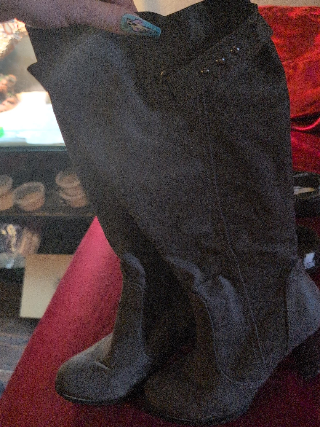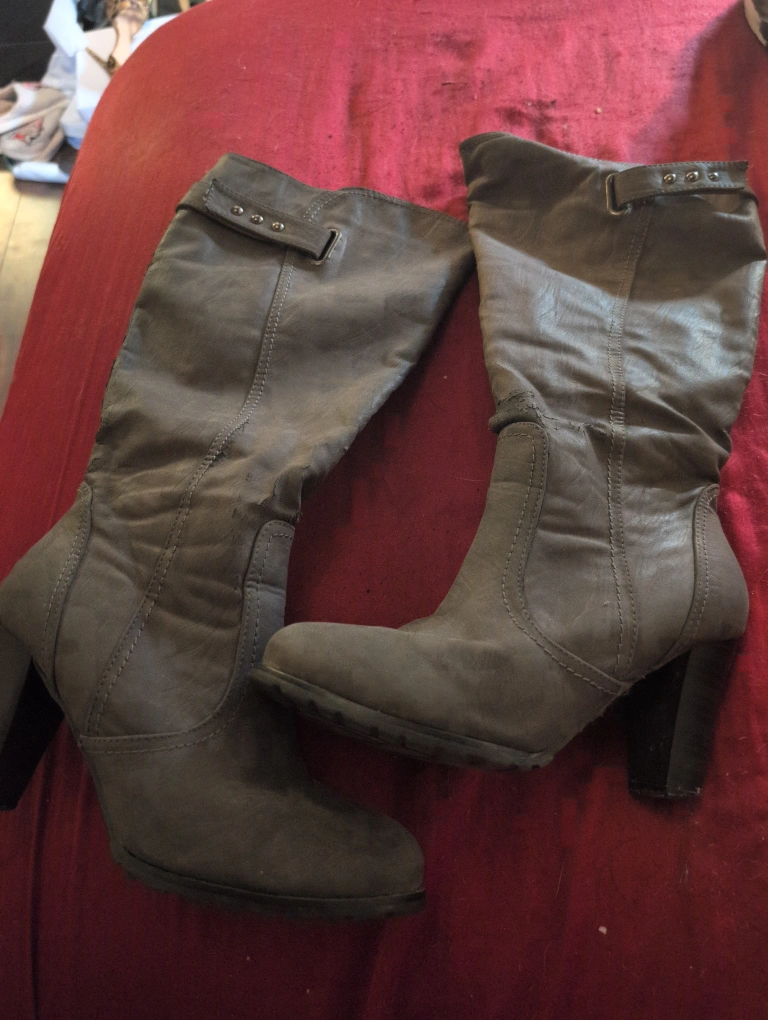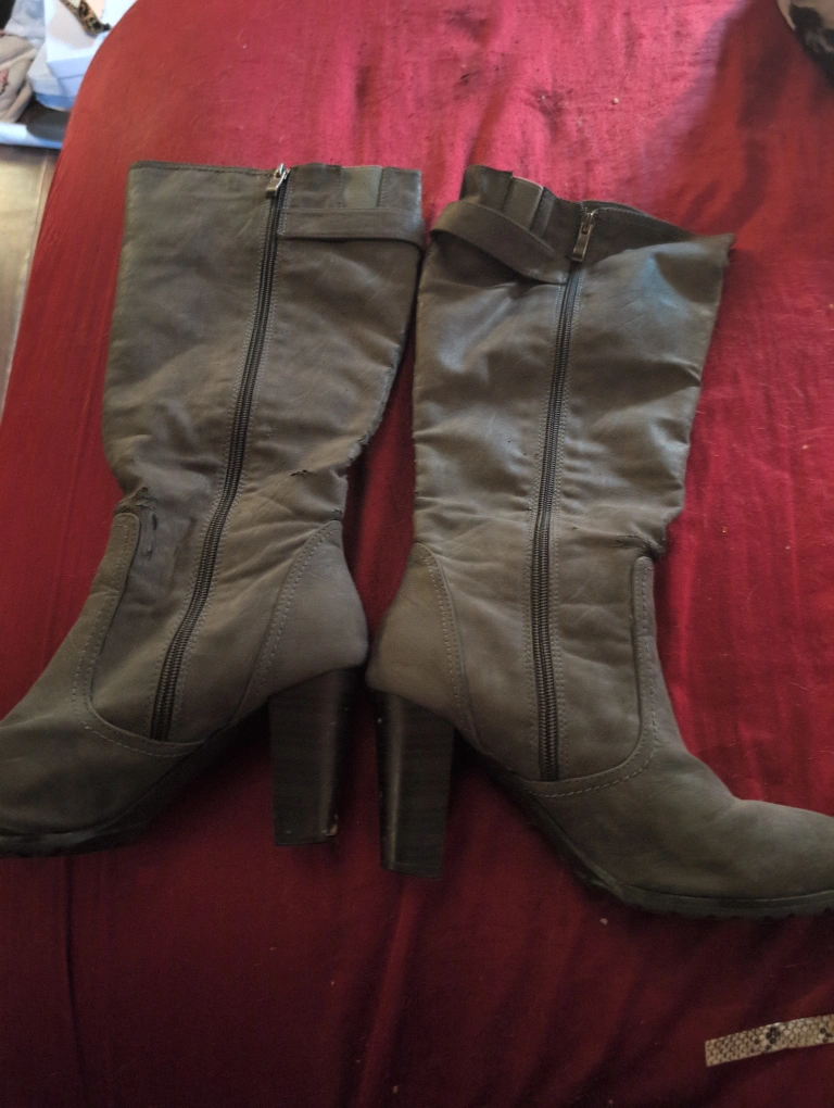 Selling a pair of grey heeled boots. They show some signs of wear, as pictured. Please take a close look at the photos to assess the condition for yourself!
